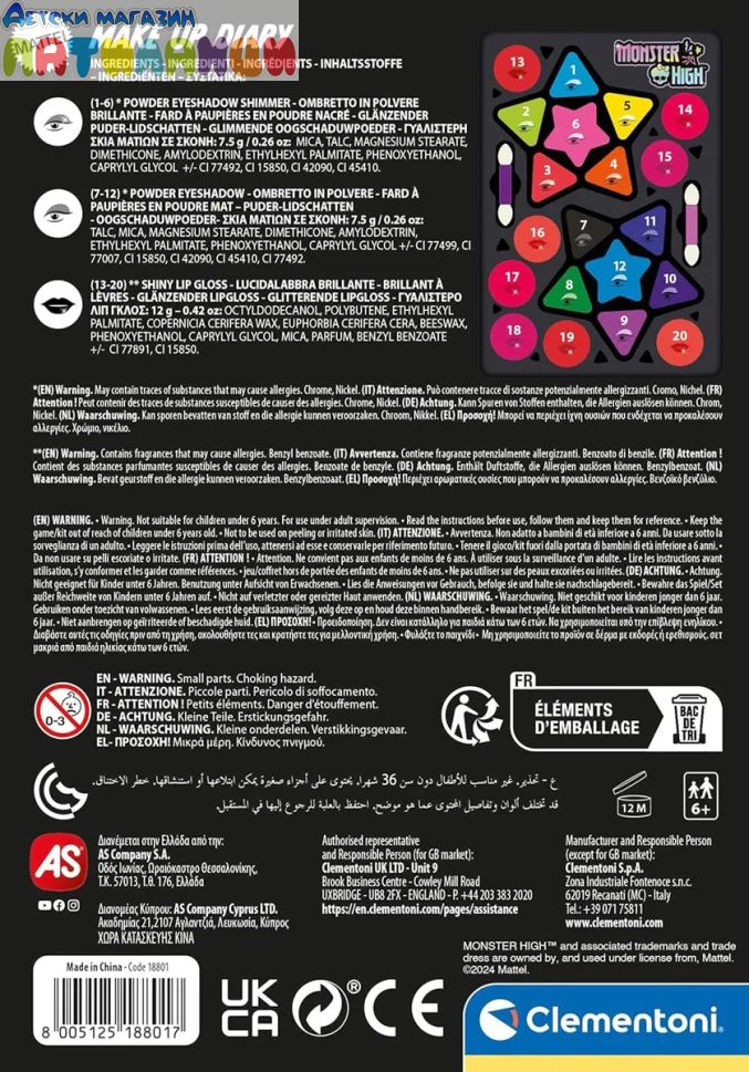 Комплектът съдържа: 12 цвята сенки за очи - общо 15 g, 8 цвята гланц за устни - общо 12 g, 2 апликатора.