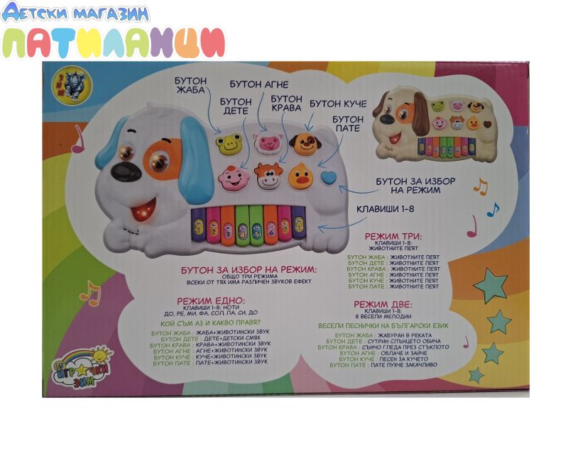 Забавна и образователна играчка, която съчетава музикални мелодии с интерактивни фрази. Със своите ярки цветове и лесни за натискане клавиши, пианото привлича вниманието на децата, насърчавайки тяхното музикално и езиково развитие.