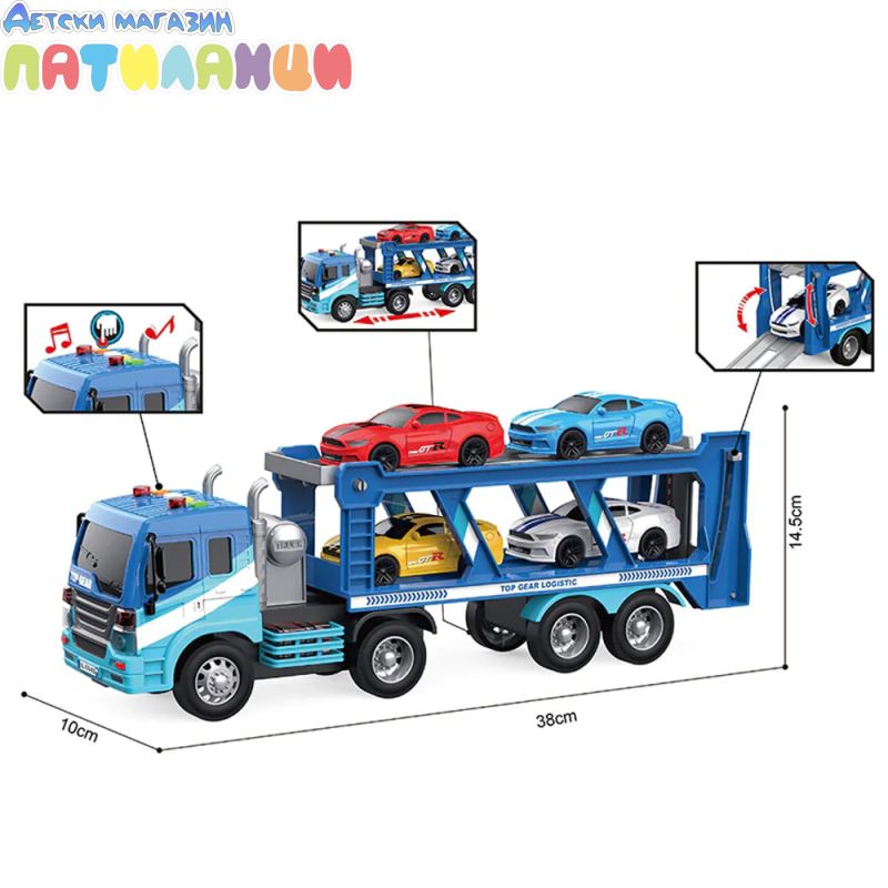 Автовозът за превозни средства е вълнуваща и забавна играчка със светлинни ефекти, реалистични звуци и движещи се елементи. С три бутона, при натискането на които се имитират звуците на стартиране на двигателя, клаксона и предупредителния сигнал, игровото изживяване е наистина реалистично.