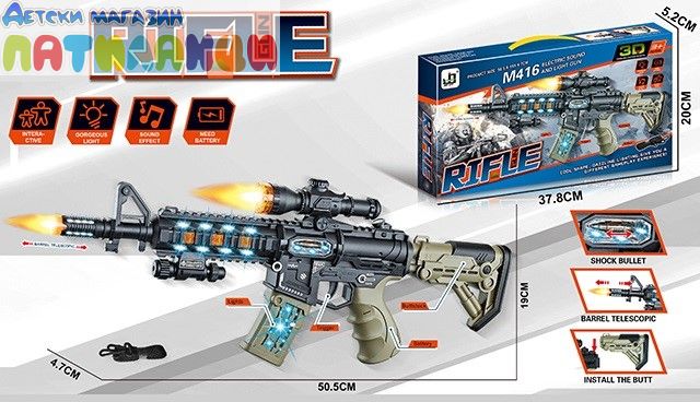 При стрелба този пистолет-автомат излъчва звук, подобен на звука на истински изстрел, а освен това има светлинни .Играчката има класически черен цвят. Можете да играете с тях „военни игри“ или просто да тренирате уменията си за стрелба с него.