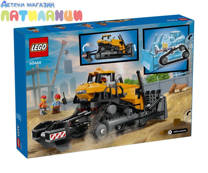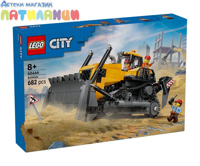 Засилете увличането на децата към готини строителни машини с тази играчка за построяване на LEGO® City Жълт булдозер (60466) за възраст над 8 години. Този впечатляващ модел е пълен с реалистични елементи и функции, включително повдигаща се лопата и двоен заден рипер, плюс детайлен двигател с видими подвижни бутала и въртящ се охлаждащ вентилатор. Комплектът включва знак за строителен обект и се предлага с минифигури на шофьор и двама работници за въображаема игра. Комплектът LEGO за игра със строителна машина включва печатно ръководство за построяване и цифрови инструкции в приложението LEGO Builder – помощник за построяване с интуитивни инструменти за машиниране и завъртане, с които децата могат да визуализират моделите от всички ъгли по време на конструиране. Комплектите LEGO City предлагат изпълнение с екшън приключения с конструиране и игра за безгранично творческо увлечение. Добавете този комплект за игра към други (продава се отделно) от гамата LEGO City за още по-големи приключения. Комплектът съдържа 682 части.
