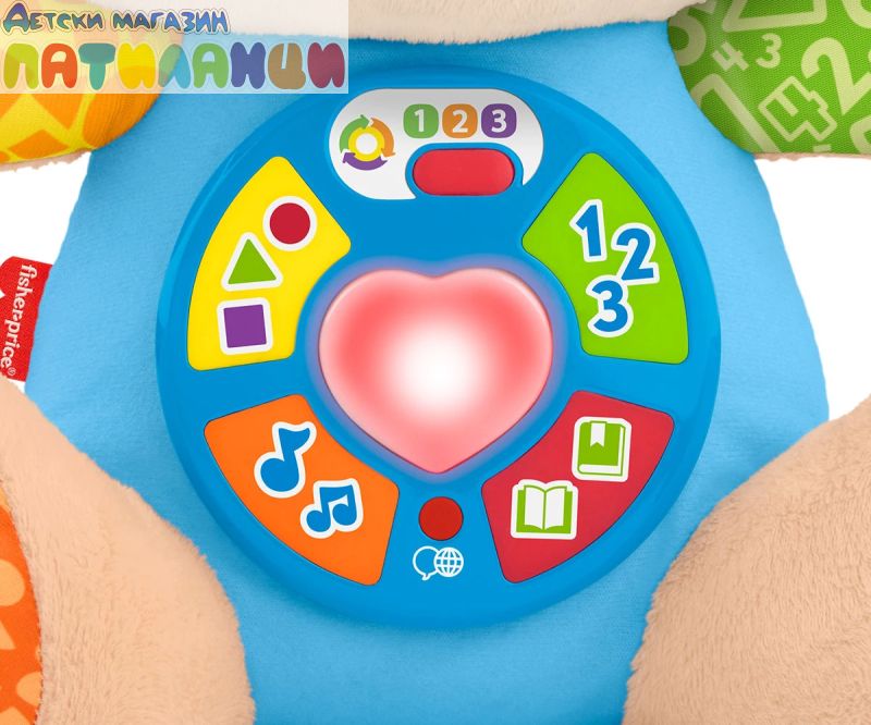 5 интерактивни бутона, разположени на лапичките, коремчето и ухото, които учат детето на първи думи, азбука, цифри, цветове, форми и още много!