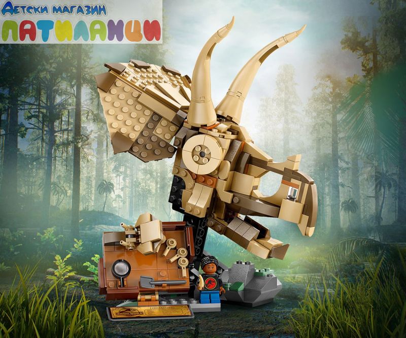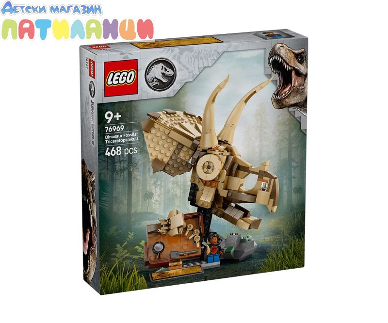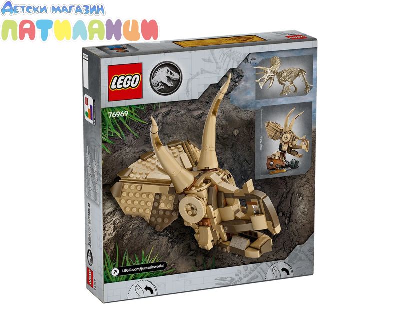 Малките палеонтолози на възраст над 9 години могат да се насладят на вдъхновена от Jurassic World игра с въображение, като събират вкаменелости на динозаври с този строителен комплект LEGO® Jurassic World „Вкаменелости на динозаври: Череп на трицератопс“ (76969). Този комплект с модел за игра от серията „Вкаменелости на динозаври“ включва череп на трицератопс с отваряща се челюст, стойка със скална основа, плоча от разкопки с минивкаменелости и инструменти за разкопки, минифигура LEGO, информационна табела и „кехлибарен“ елемент с уловен комар. Приложението LEGO Builder ще направлява феновете на динозаврите в интуитивното строително приключение и позволява мащабиране и завъртане на моделите в 3D, запазване на комплекти и проследяване на напредъка. Докато строят, те може би ще усетят същото вълнение, което изпитват археолозите, когато направят откритие! Открийте и други комплекти LEGO Jurassic World (продават се отделно), за да вдъхновите въображаемата игра на децата с играчки за динозаври за пресъздаване на класически сцени или модели на динозаври, които да построят и да показват с гордост. Комплектите са забавни подаръци за деца, любители на динозаври и фенове от всички възрасти.