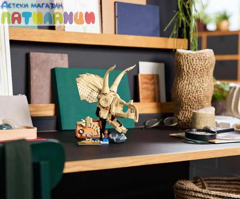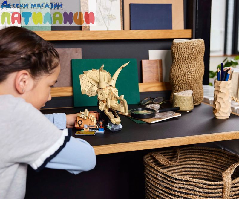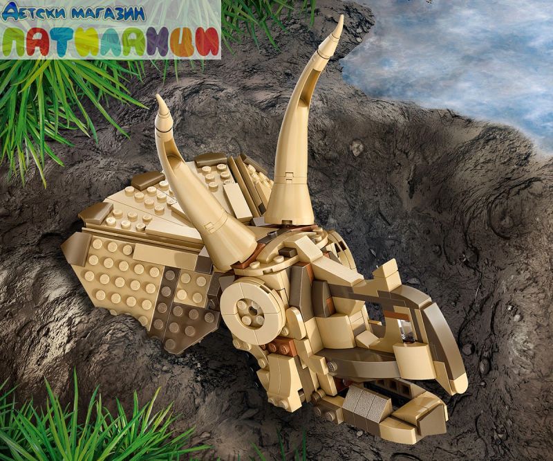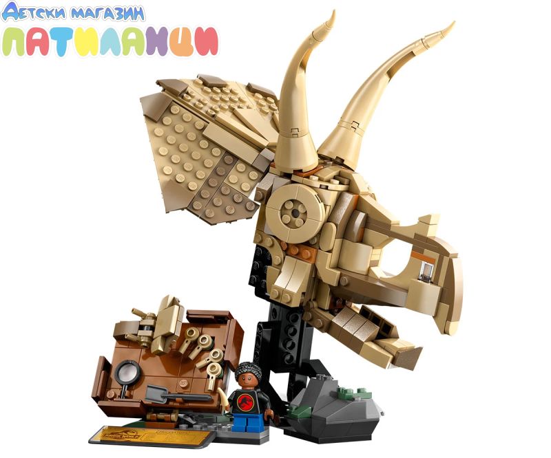 Подвижен череп на трицератопс с отваряща се челюст – този череп за деца може да бъде поставен отворен или затворен, или на стойката, или до минифигурата, плочата за разкопки, минивкаменелостите и инструменти за разкопки;