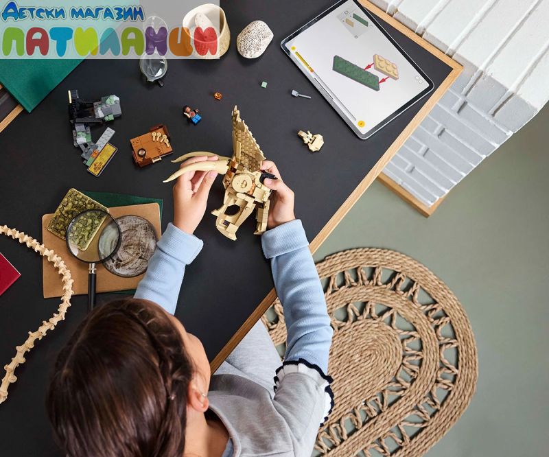 Строителен комплект с динозавър – има череп на трицератопс със стойка, информационна табела, плоча от разкопки с минивкаменелости и инструменти за разкопки, минифигура LEGO на младши палеонтолог и „кехлибарен“ елемент;
