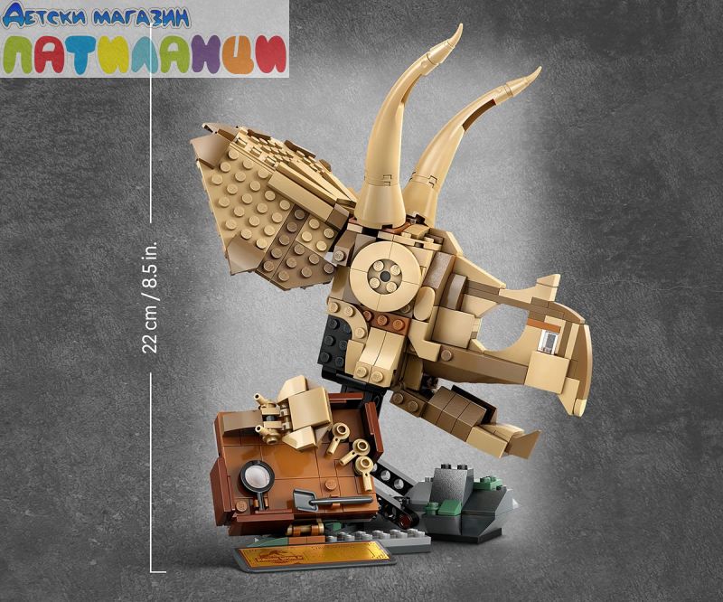 Размери – този комплект LEGO® от 468 части включва череп на трицератопс на стойка, които заедно са с размери над 22 см височина, 17 см ширина и 17 см дълбочина.