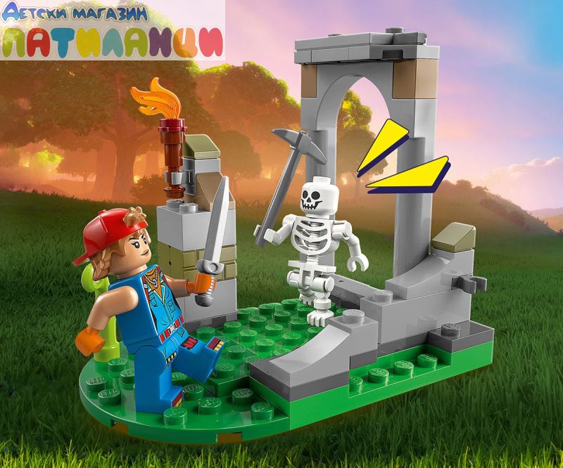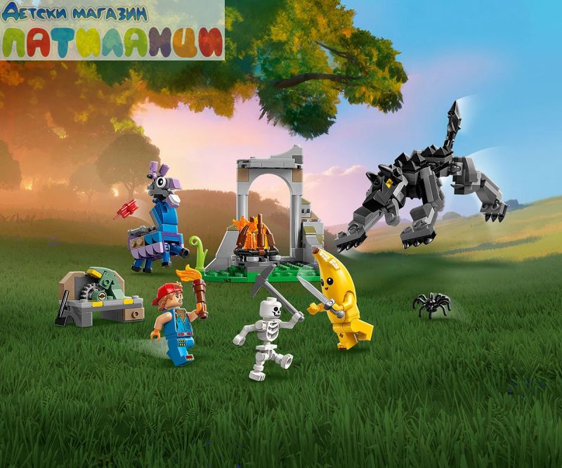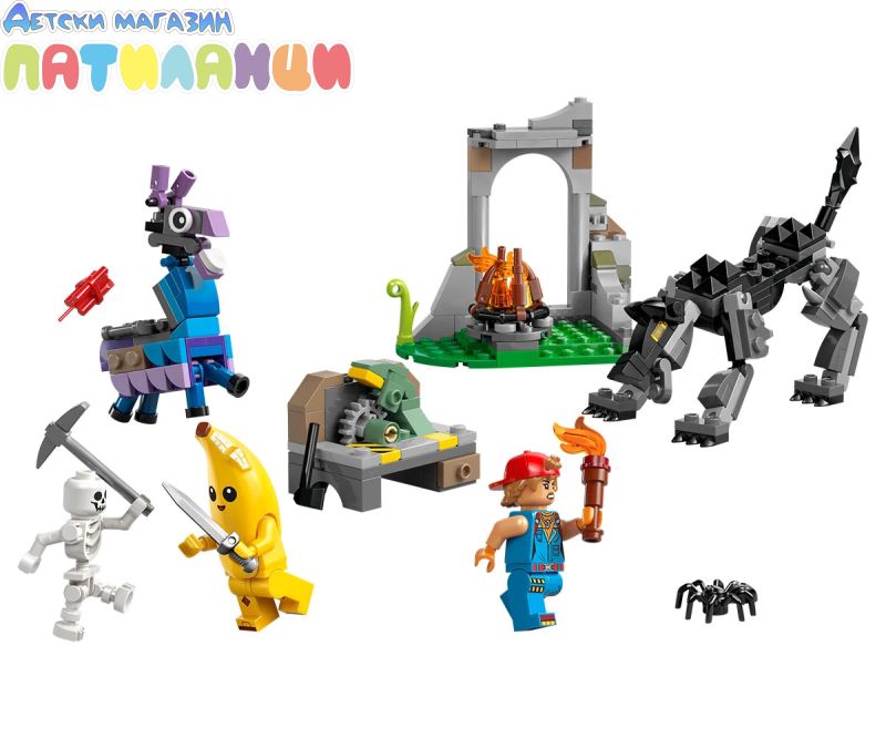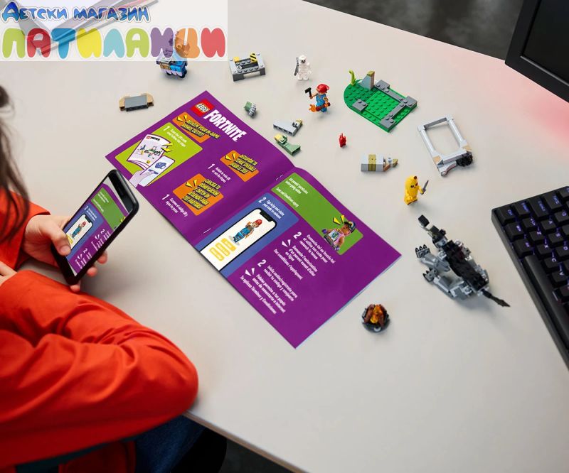 Строителен комплект от видеоигра – комплектът възпроизвежда първите предизвикателства, с които се сблъскват играчите във видеоиграта LEGO® Fortnite® Odyssey, и включва лагерен огън, работна маса и руини;