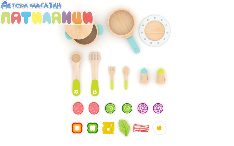 Дървен детски комплект 22 части. Всички дървени части са покрити с бои на водна основа, които са напълно безопасни за децата. Подходящо допълнение към всяко кухненско обзавеждане. Насърчава децата към творческо мислене. Развива фините двигателни умения,въображението.