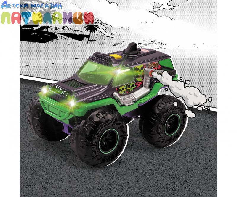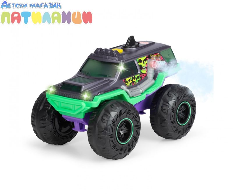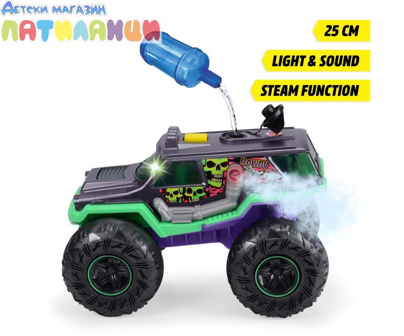 Dickie Toys - Монстър камион Rowdy Rocker от 3 години (25 см) - кола с готини светлинни, звукови и парни ефекти, играчка кола за деца със свободен ход, окачване и гумени гуми, включително батерии