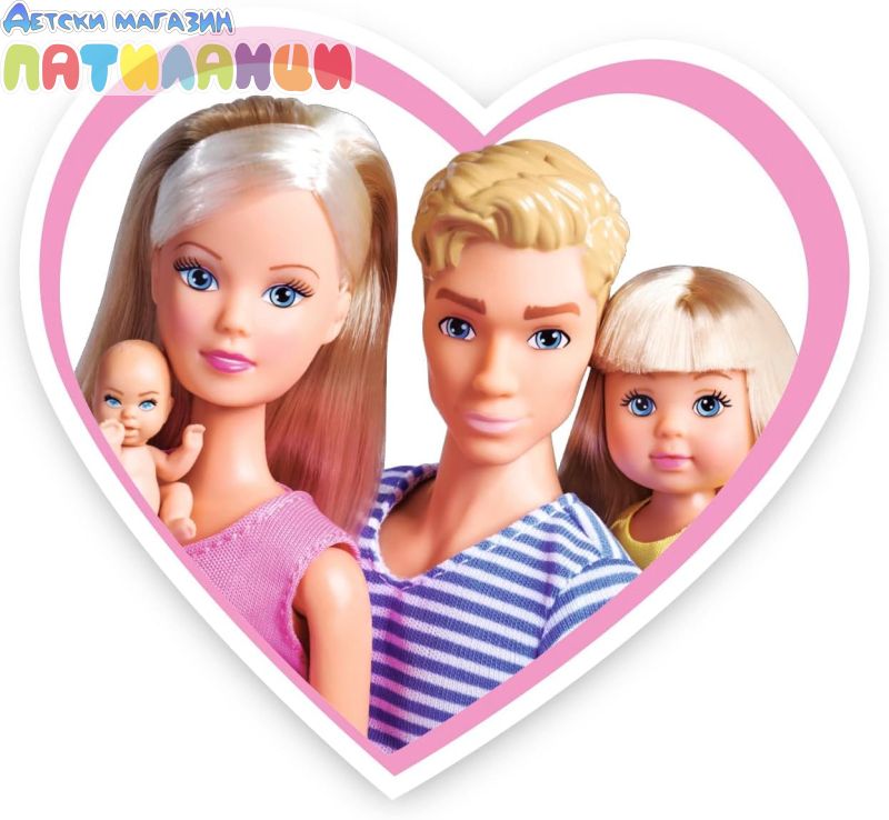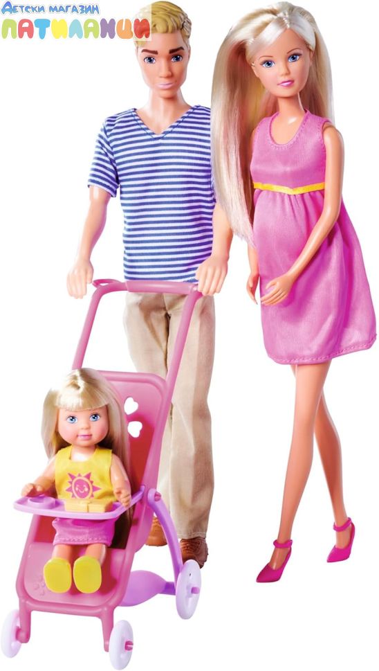 Семеен комплект: В комплекта са включени освен бременната Стефи, висока 29 см, сестра ѝ Еви Лав (12 см) и приятелят ѝ Кевин (30 см). Можете да ходите заедно с количката. Комплект от 11 аксесоара допълва комплекта.