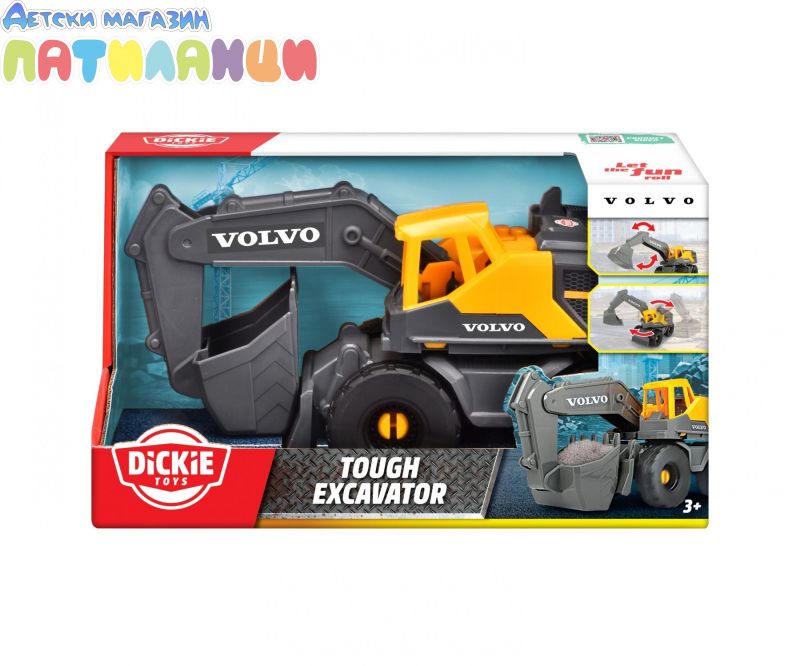 Dickie Toys - Volvo Excavator Tough Excavator (26 см) - играчка багер с лопата за деца над 3 години със свободен ход, подвижно рамо и лопата, подходяща като играчка за пясък