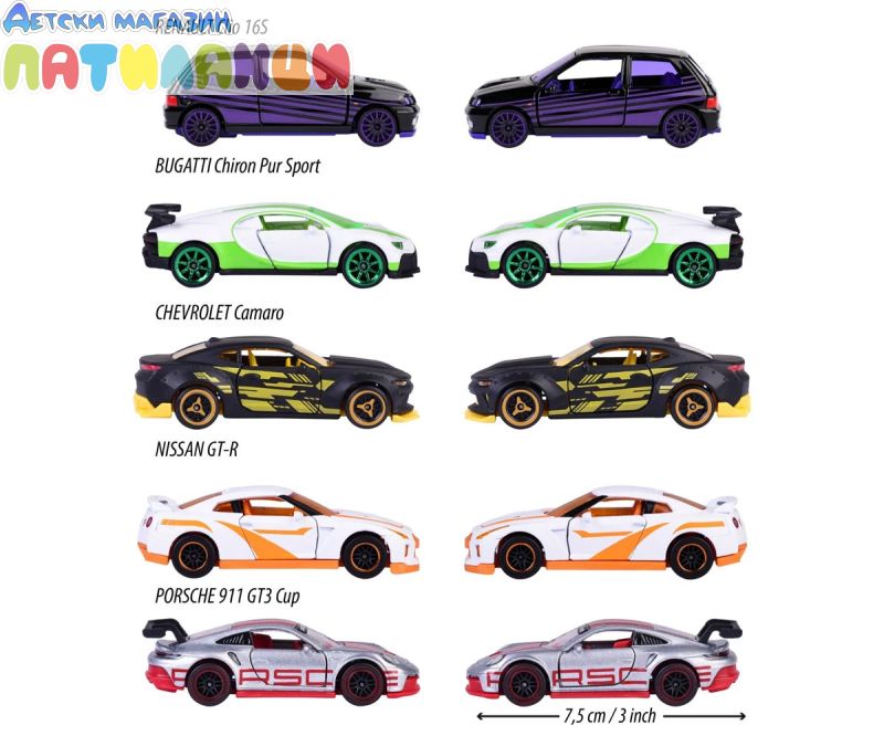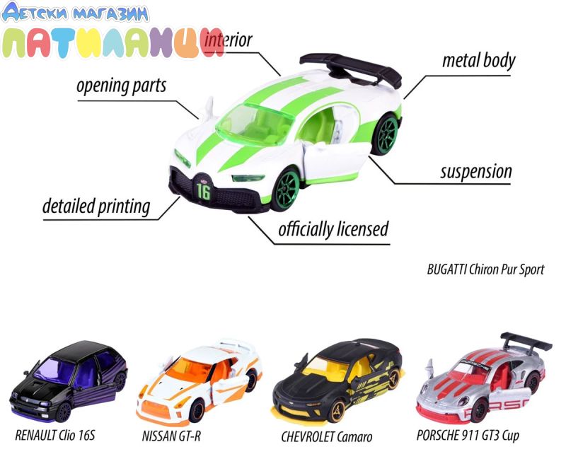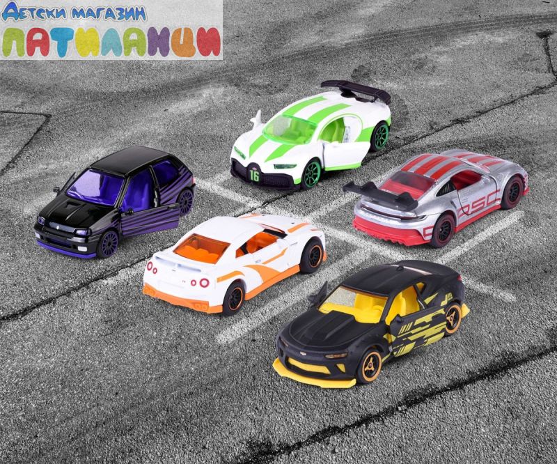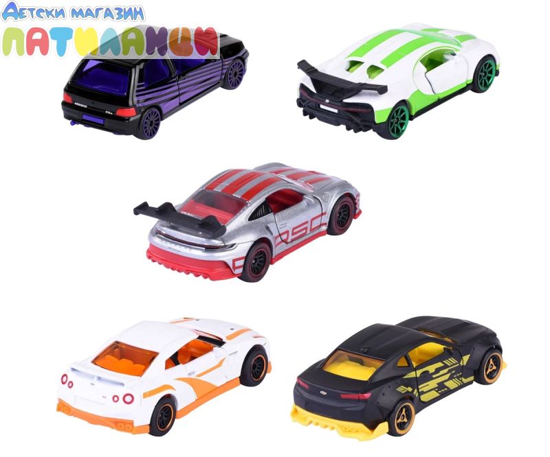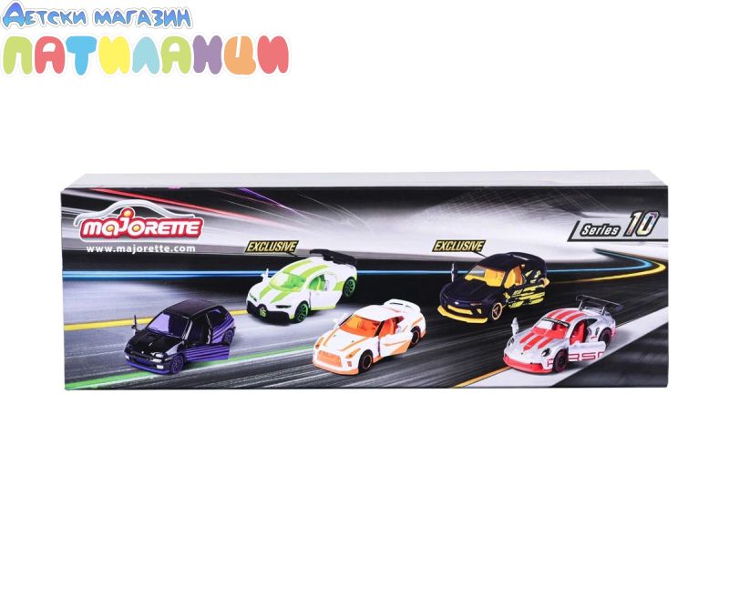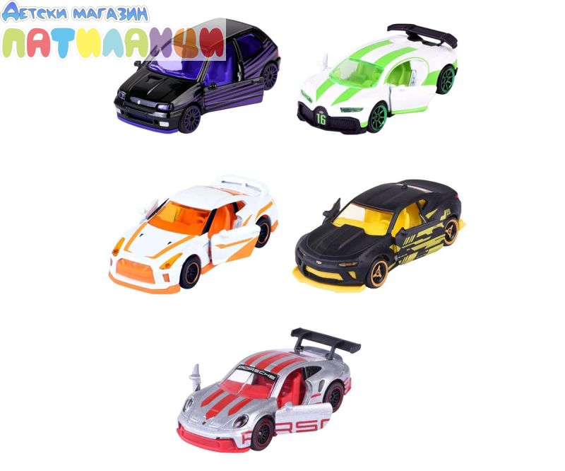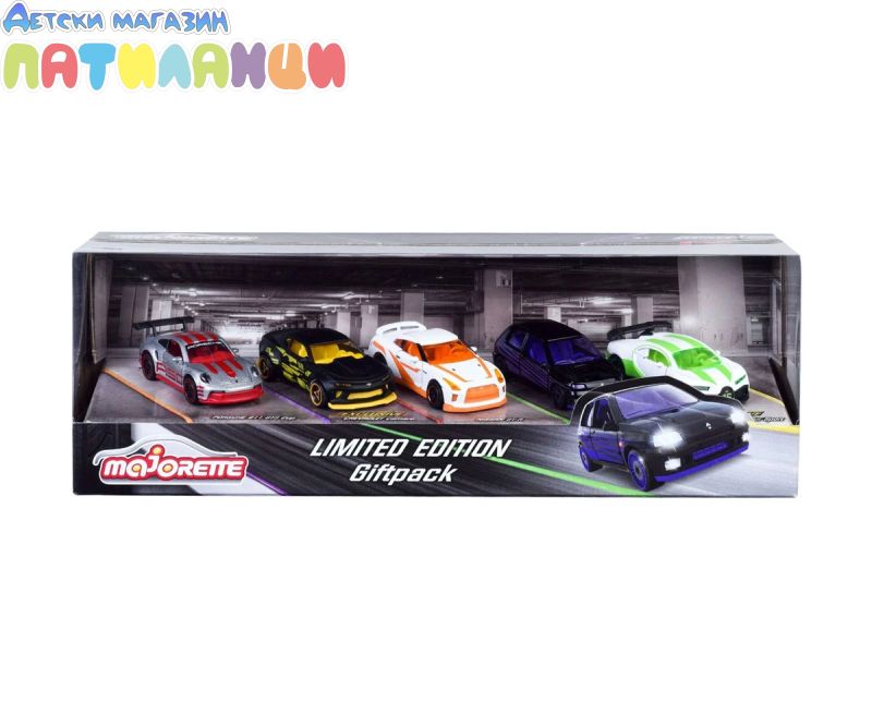 Този комплект включва 5 модела автомобили с много функции и уникален дизайн. Някои детайли на автомобила могат да се отварят като врати, капак и други, за да се направи мини моделът на автомобила по-реалистичен. Подаръчният пакет MAJORETTE включва 5 модела автомобили PORSCHE 911 GT3 CUP, NISSAN GT-R, RENULT CLIO 16S, както и ексклузивни модели на CHEVROLET CAMARO и BUGATTI CHIRON PUR SPORT, налични само в този комплект.