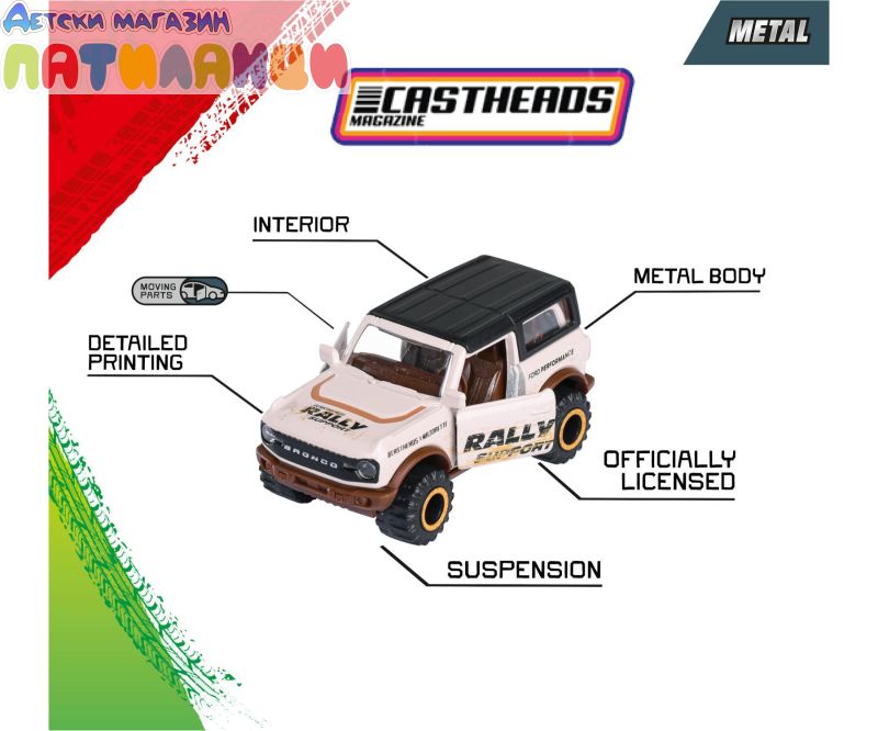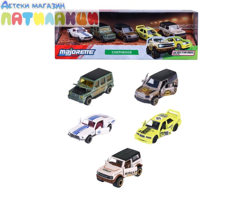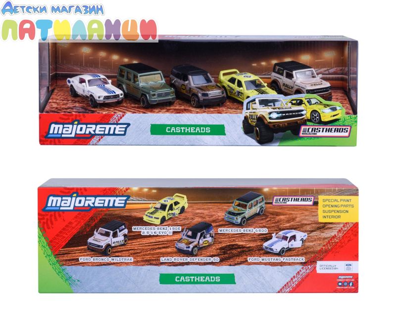 Готови ли сте за 5 модела коли с максимален характер? Изданието CastHeads от Majorette съчетава висококачествен метал с дизайнерския дух на списание CastHeads – индивидуален, груб и пълен с детайли. Всеки модел коли впечатлява с прецизна изработка, впечатляващо боядисване и стил, който се откроява от тълпата.