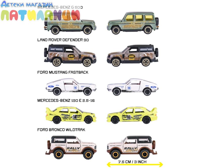 • Комплект „Неопитомени превозни средства“ - 5 модела коли с характер: 1. Ford Mustang Fastback, 2. Ford Bronco Wildtrak, 3. Land Rover Defender 90, 4. Mercedes-Benz 190 E 2.5-16 EVO II и 5. Mercedes-Benz G 500.