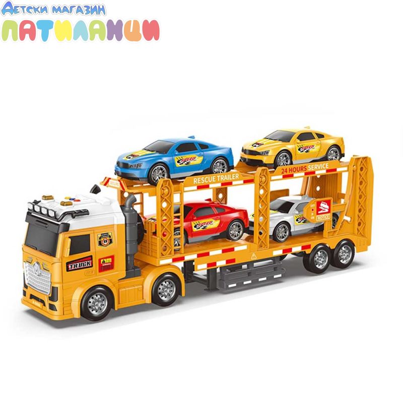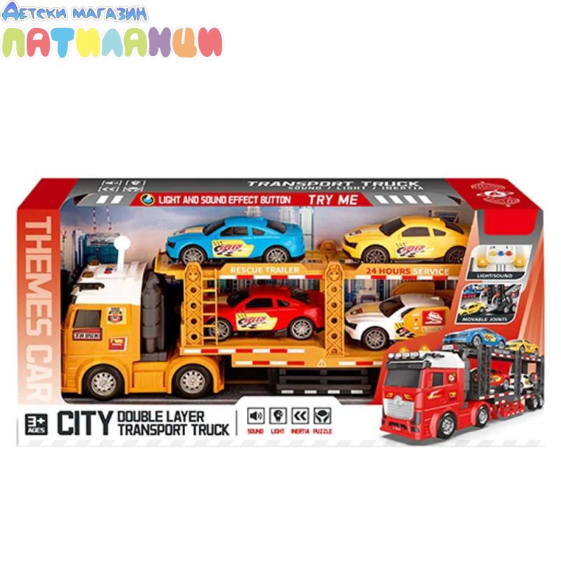 Автовозът за превозни средства е вълнуваща и забавна играчка със светлинни ефекти, реалистични звуци и движещи се елементи. С три бутона, при натискането на които се имитират звуците на стартиране на двигателя, клаксона и предупредителния сигнал, игровото изживяване е наистина реалистично.