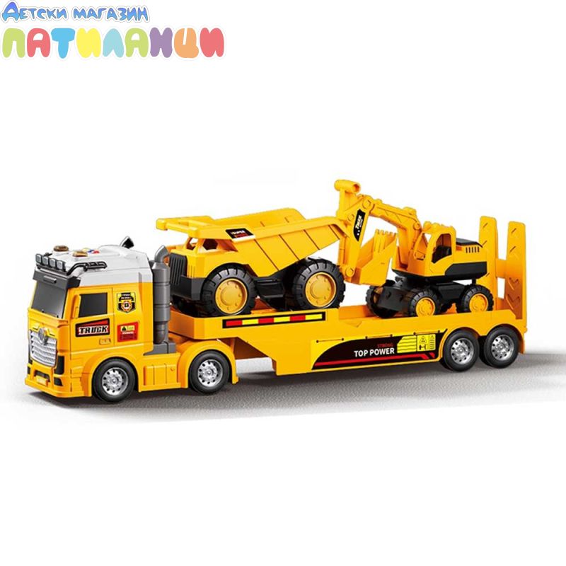 Автовозът се отваря в рампа, по която можеш да спускаш машините, включени в комплекта.