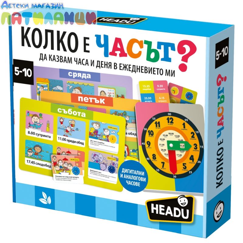 С образователната игра, произведен от Headu, вашият малчуган ще се научи да познава часа, дните от седмицата и да измерва времето с помощта на часовника със стрелки, които се движат. Докато играе, детето ще се запознае с понятията ден, час, минута и секунда. Ще може да упражнява разпознаването на часовете както на механичен, така и на електронен часовник. Играта е подходяща за деца от 5 до 10 години. Продуктът е изцяло преведен на български език.