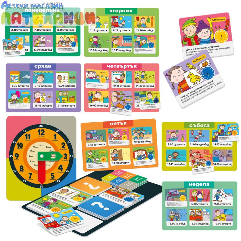 Забавна и практична игра, която помага на децата да се научат да разпознават часовника и да свързват времето с ежедневни дейности. Създадена от италианската марка Headu, играта е адаптирана на български език.