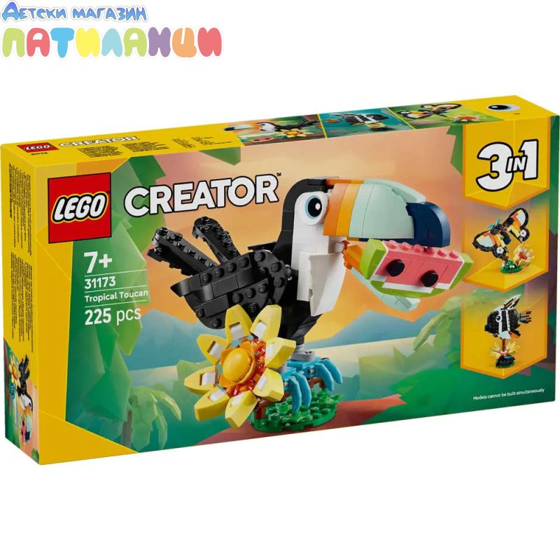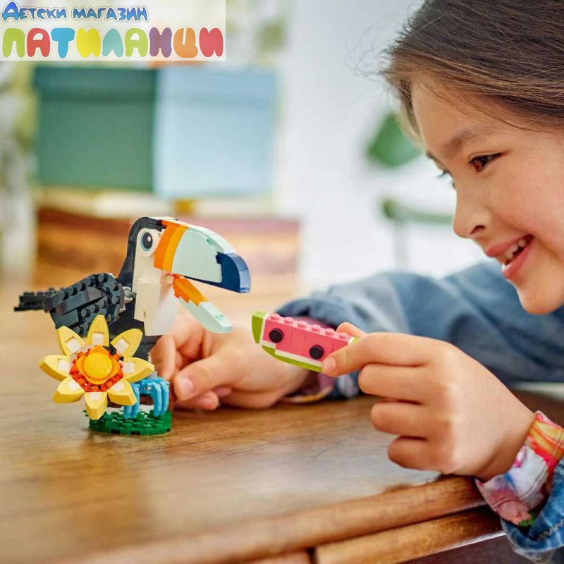 Насладете се на тропическо забавление с този красив строителен комплект LEGO® Creator Диви животни: Тропически тукан „3 в 1“ (31173). Птицата LEGO седи на клон с голямо цвете от тухлички и има резен диня, а за още повече игра може да движи крилата, клюна и перата на опашката си. Децата получават 3 различни възможности за построяване на животни LEGO с едни и същи тухлички: подвижен тукан с резен диня, който може да се постави в човката му; цветна пеперуда с подвижни крила, летящи над туфа трева и цвете, и тропическа риба с подвижни перки, които могат да се въртят на 360 градуса на стойката си, изобразяваща морското дъно. Комплектите LEGO Creator „3 в 1“ вдъхновяват детската креативност с 3 различни модела за сглобяване във всяка кутия. Децата с удоволствие ще построяват и променят моделите многократно. Комплектите „3 в 1“ предлагат гама, подходяща за най-големите им увлечения, включително свръхбързи превозни средства, невероятни животни и детайлни къщи. Имайте предвид, че моделите не могат да бъдат построени едновременно. Комплектът съдържа 225 части.