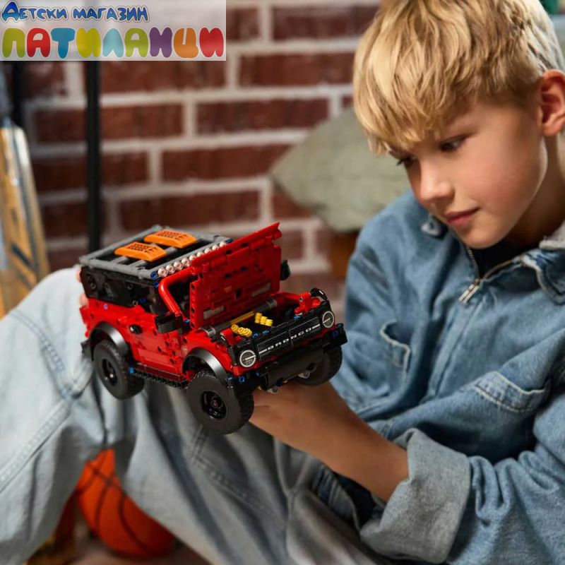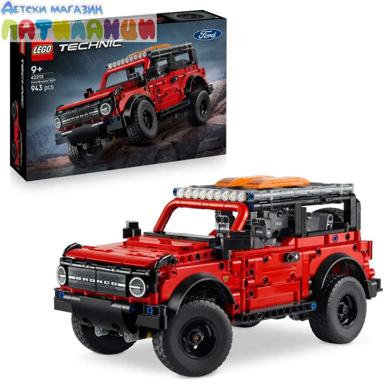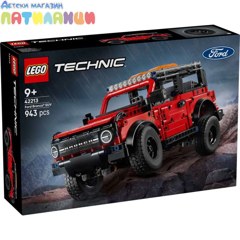 Вдъхновете децата да мечтаят с размах, докато създават безкрайни офроуд приключения с комплекта с модел на кола LEGO® Technic Джип Ford Bronco® (42213) за момчета и момичета на възраст над 9 години. Комплектът се отличава с реалистични детайли, включително отварящи се врати и окачване с предна ос и подвижна задна ос. Децата ще изследват много, докато управляват джипа с помощта на резервното колело отзад, са после повдигнат капака, за да разкрият двигателя V6. Финалните щрихи включват багажник на покрива с 2 летви и поразителните червени и черни детайли на колата. Тази научна играчка за построяване е чудесен подарък за любителите на колите или всяко дете, което обича да изследва и офроуд превозните средства. Нека децата открият лесно и интуитивно строително приключение с приложението LEGO Builder, където те могат да мащабират и завъртат 3D моделите, да запазват комплекти и да проследяват напредъка си. Комплектът съдържа 943 части.