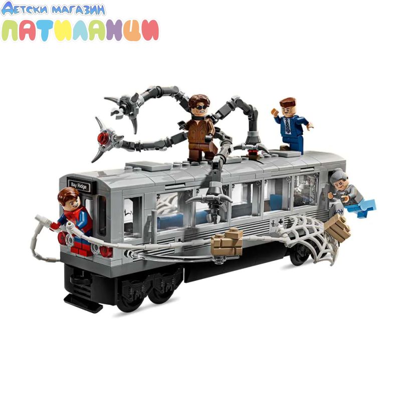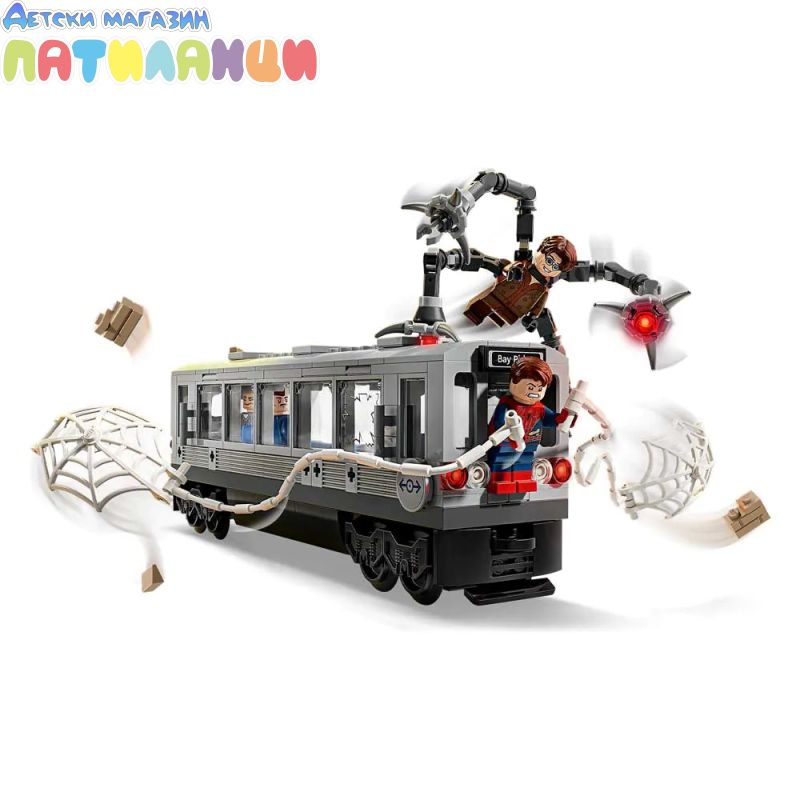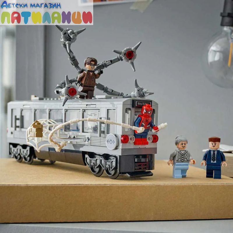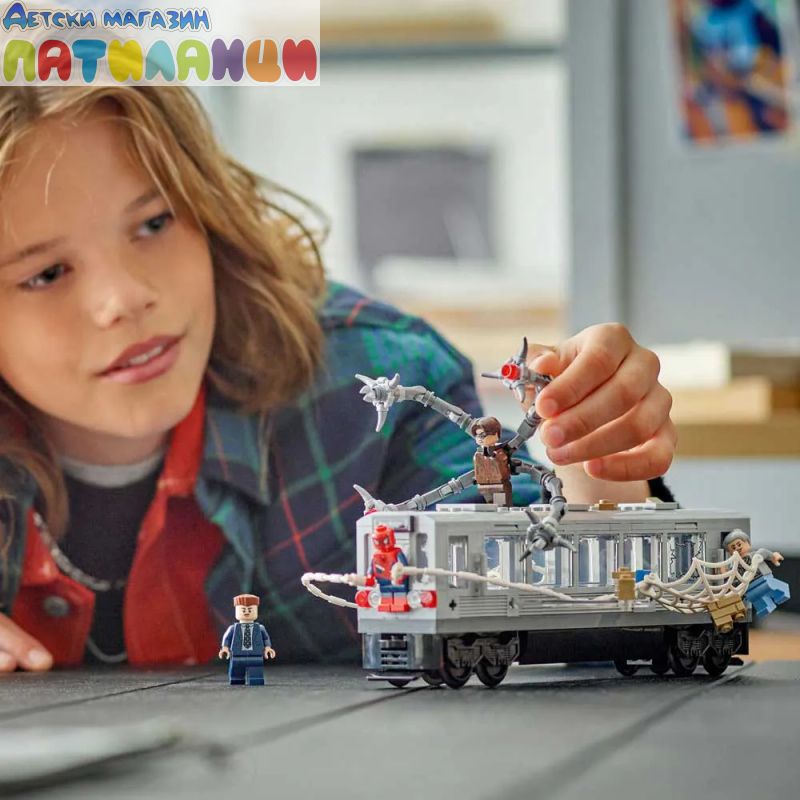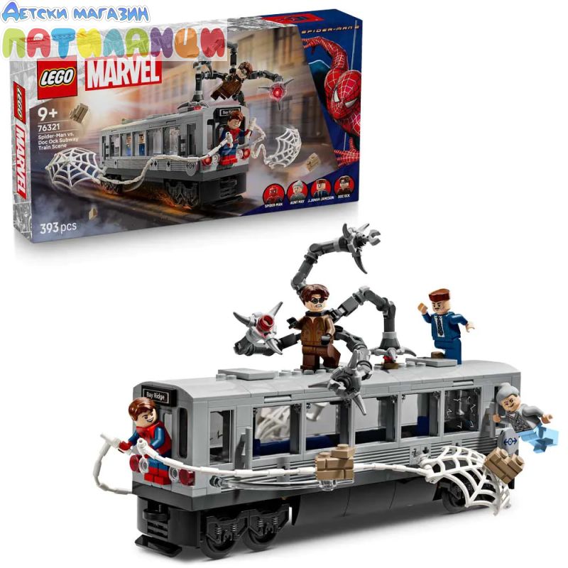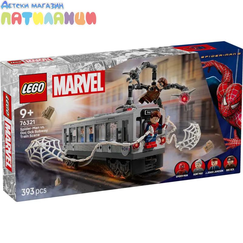 Спайдърмен срещу Док Ок: сцена в метрото“ (76321) е строителен комплект с влак за деца, които обичат екшън приключения и бойни играчки за построяване LEGO® ǀ Marvel. С безкрайни възможности за въображаема игра и показване, тази строителна играчка със супергерой е чудесен подарък за момчета и момичета на възраст над 9 години. Този строителен комплект с влак от метрото и супергерой е базиран на емблематична сцена от филма Spider-Man 2 на Marvel Studios. Включени са 4 минифигури: Джей Джона Джеймисън, леля Мей, Спайдърмен и Док Ок. Минифигурата на Спайдърмен има сменяеми глави – с маска и без маска – и голяма паяжина, която може да се прикрепи към влака. Минифигурата на Док Ок има 4 подвижни пипала, като две са с елементи на „лазерен лъч“, а две са с щипки, които се прикрепят към влака. Повдигащият се покрив осигурява достъп до интериора на влака, който има място за минифигура на пътник. За допълнително цифрово забавление строителите могат да мащабират, да завъртат модели в 3D и да проследяват напредъка си с помощта на интуитивното приложение LEGO Builder. Комплектът съдържа 393 части.