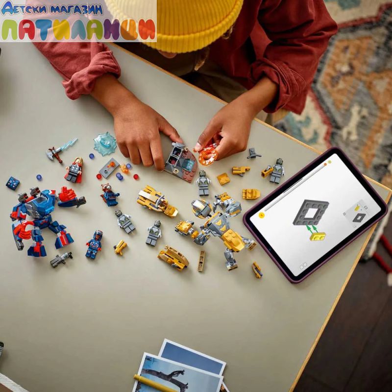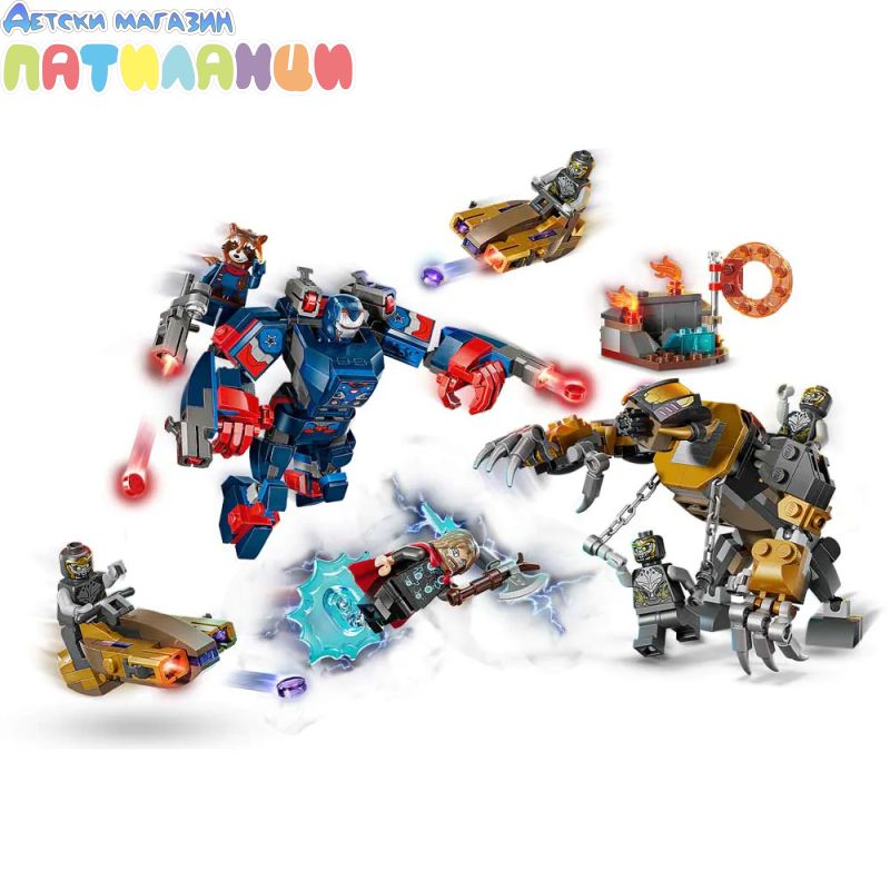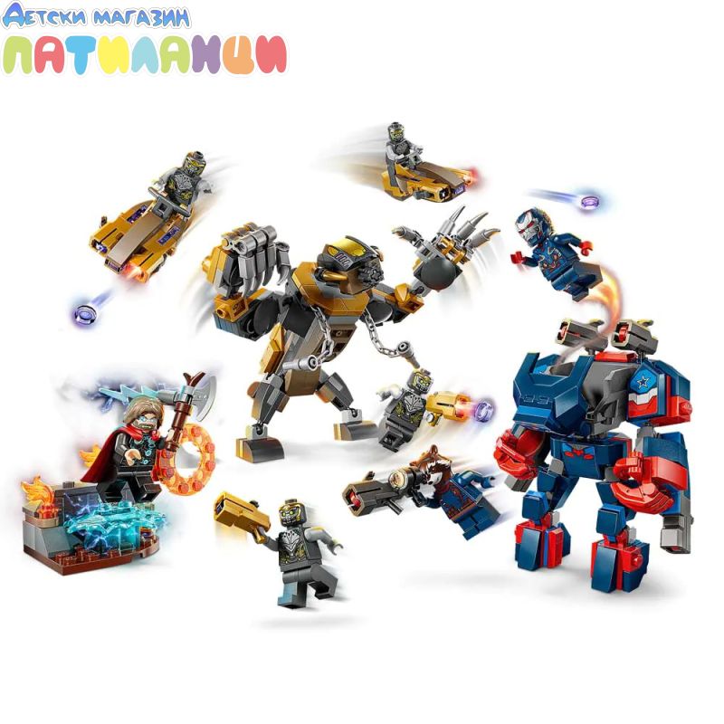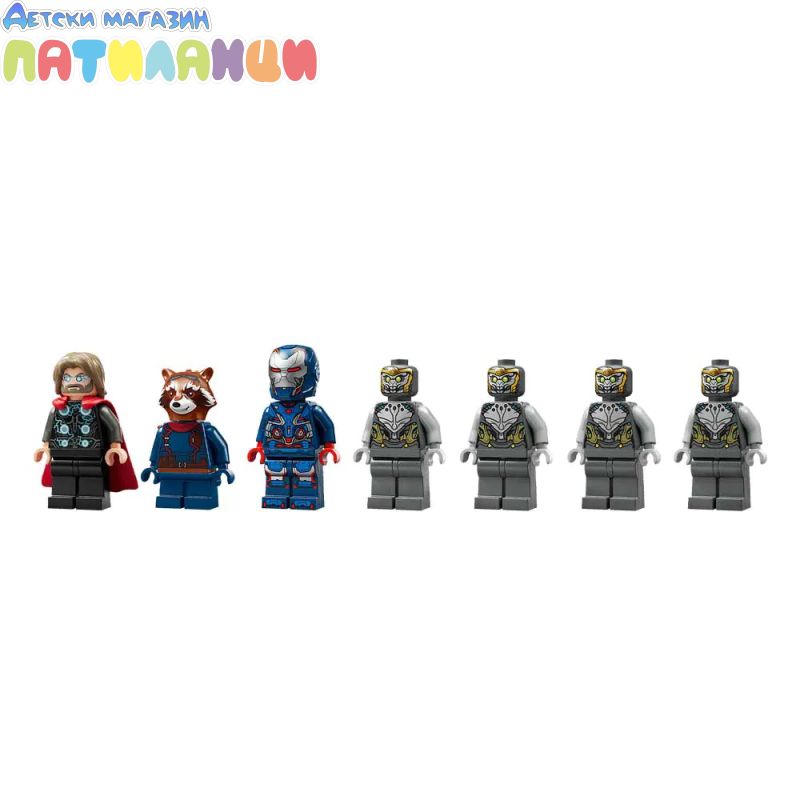 Минифигури LEGO® ǀ Marvel – има 7 минифигури: Железен патриот MK2; Ракета с голямо оръдие; Тор с Буреносец; и четирима воини на Читаури, двама от които със златни оръдия