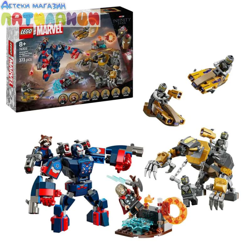 LEGO® ǀ Marvel Отмъстителите: Краят Тор срещу Читаури(76322) е първокласна супергеройска играчка за конструиране за деца на възраст над 8 години. Този универсален подарък за фенове на Marvel е идеален за любителите на играчки за конструиране и игра, екшън герои и филма Отмъстителите: Краят на Marvel Studios. Базиран на емблематична бойна сцена от филма за Отмъстителите на Marvel, този комплект със супергерой включва две големи фигури LEGO: роботът Железен патриот с 4 оръдия и страховитата горила на Читаури. И двете са подвижни за динамична игра. Има 7 минифигури: Железен патриот MK2; Ракета с голямо оръдия; Тор с Буреносец и четирима воини Читаури, двама от които със златни стрелци. Други елементи включват 2 реактивни скутера и малка сцена за Тор, където могат да се съхраняват амуниции за оръдия. Този комплект за построяване и игра се свързва с Отмъстителите: Краят Последната битка (76323) за още повече игра. Строителите могат също така да мащабират и завъртат модели в 3D с помощта на забавното интуитивно приложение LEGO Builder. Комплектът съдържа 373 части.
