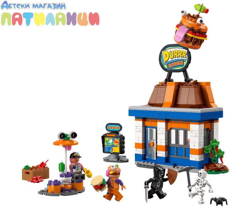 Искате ли да хапнете в емблематичен ресторант от видеоигра? Забавлявайте се, докато построявате LEGO® Fortnite® Durrr Burger Restaurant, преди да откриете вълнуващите детайли и минифигури. Комплектът включва Beach Bomber, Beef Boss, Grimey и скелет, плюс аксесоари за ролева игра. Разгледайте менюто за поръчка от колата, насладете се на питие от машината за газирани напитки и се пазете от паяка на тавана!