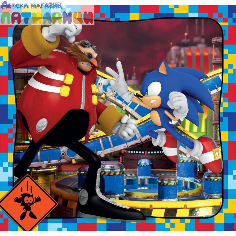 Комплектът Clementoni Sonic съдържа 3 пъзела по 48 части с цветни и динамични илюстрации на любимия син таралеж и приятелите му.