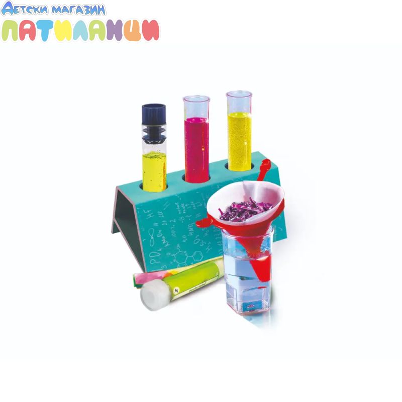 Комплектът включва и изключително богат набор от "лабораторни инструменти", които ще са необходими на децата за извършването на опитите. Сред средствата за експериментиране ще намерите индикаторна хартия, филтърна хартия, мерителна чаша, фуния, епруветки със запушалки, балони, пинцети, мерителна пипета, шпатула, бъркалка, ключ за безопасност за епруветки, стойка за епруветки, различни картонени аксесоари, карта, лист с отговори, малка четка и карти. Остава само вие да дадете зелена светлина на малките учени у дома. Образователният комплект е подходящ за деца над 9 години. Желателно е опитите да бъдат проведени в присъствието на възрастен.