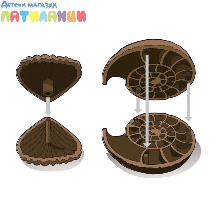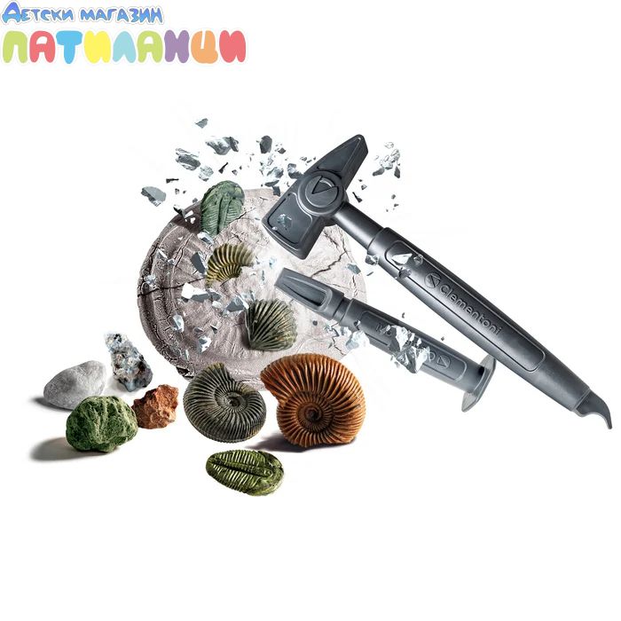 Концепция: Комплектът съдържа тухла във формата на аммонит от гипс, в която са "захвърлени" образци на фосили и скали. Децата използват инструменти, за да ги извадят, изучат и съберат — като малки палеонтолози.