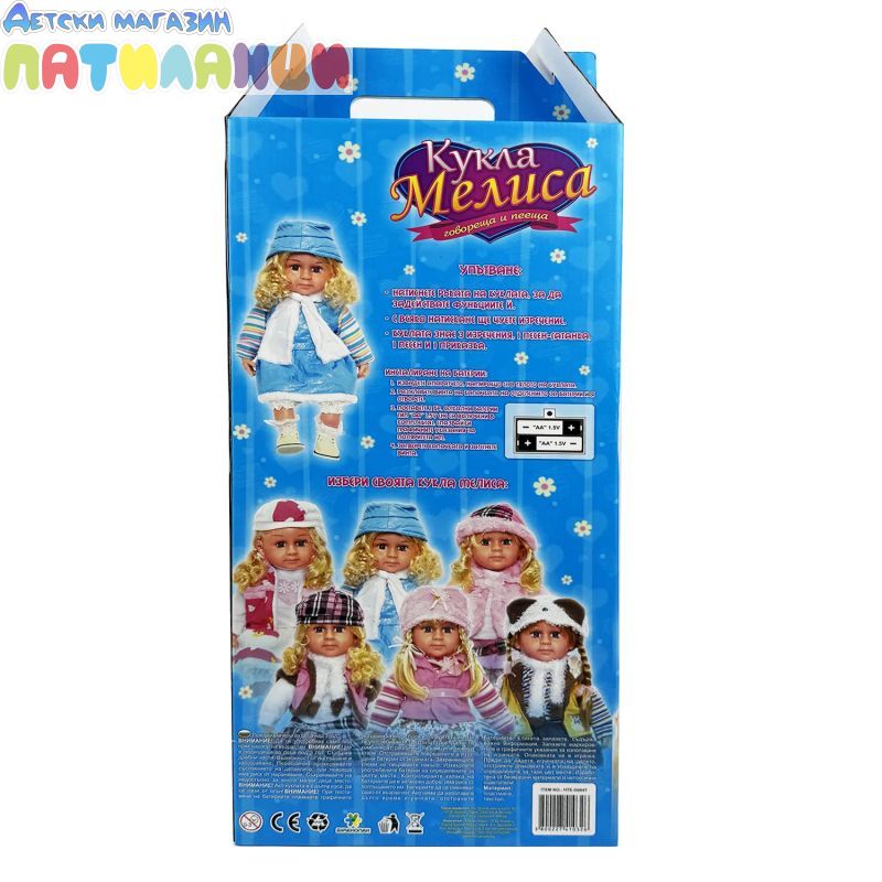 Запознай се с Мелиса - пеещата и говореща кукла, която идва при теб, за да бъде твоята най-добра приятелка! Първо обаче, както казва Мелиса: "Преди да се запознаем, ще ти разкажа малко за себе си, какво обичам, какви са моите интереси и коя е моята любима приказка". Тези думи са началото на поредица от реплики, които куклата може да "рецитира" на български език. Да, Мелиса е говореща и даже пееща кукла. За да се активират звуковите функции, е необходимо просто да се натисне последователно лявата ръка на куклата. С всяко следващо натискане на скритото копче, "рециталът" ще се променя. В 3 изречения Мелиса ще разкаже за себе си. Освен това, тя може да зададе и една гатанка, която представя под формата на песничка. А когато отговориш на гатанката, ще разбереш и кое животинче е нейният домашен любимец. За още по-забавно настроение Мелиса "е приготвила" и една песничка. В нея с реплики и весела мелодия бързо ще ти разкаже за приятелството. Част от "репертоара" е и разказването на приказната история "Спящата красавица". Интересен "рецитал" има Мелиса, нали? Направен е като забавна, но и образователна детска програма. Неусетно в играта с интерактивната кукла децата развиват речта си и умението си да говорят правилно. А и нищо чудно да научат гатанката или приказката, които разказва Мелиса.