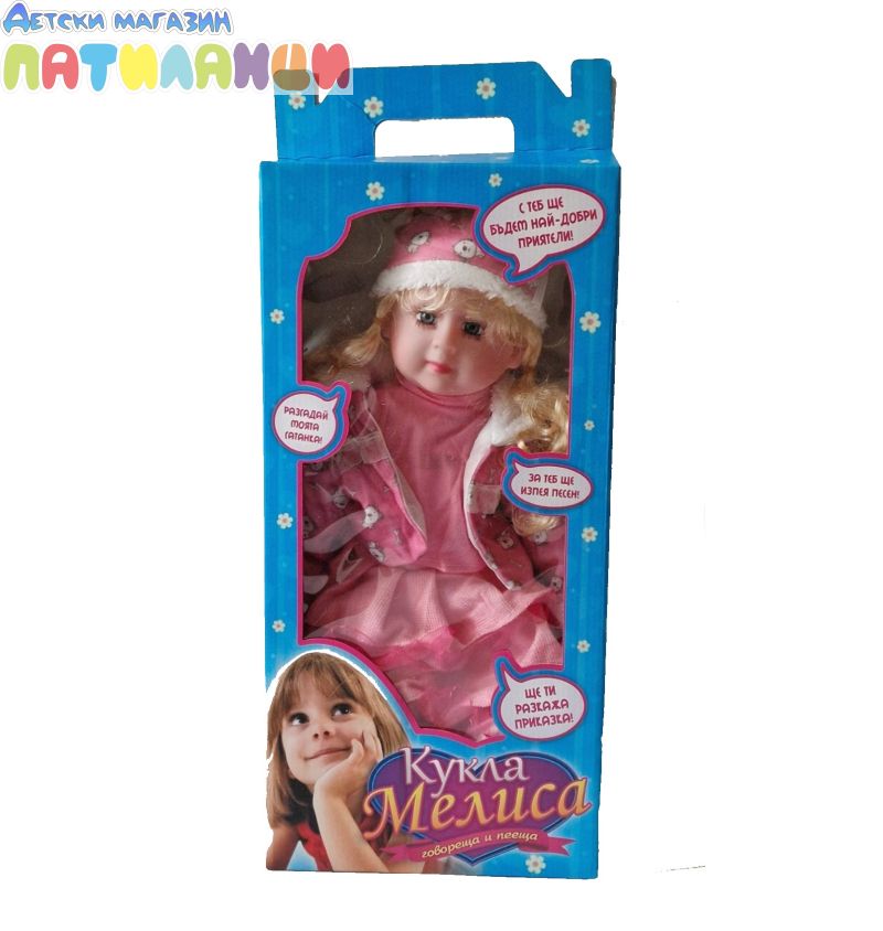 Запознай се с Мелиса - пеещата и говореща кукла, която идва при теб, за да бъде твоята най-добра приятелка! Първо обаче, както казва Мелиса: "Преди да се запознаем, ще ти разкажа малко за себе си, какво обичам, какви са моите интереси и коя е моята любима приказка". Тези думи са началото на поредица от реплики, които куклата може да "рецитира" на български език. Да, Мелиса е говореща и даже пееща кукла. За да се активират звуковите функции, е необходимо просто да се натисне последователно лявата ръка на куклата. С всяко следващо натискане на скритото копче, "рециталът" ще се променя. В 3 изречения Мелиса ще разкаже за себе си. Освен това, тя може да зададе и една гатанка, която представя под формата на песничка. А когато отговориш на гатанката, ще разбереш и кое животинче е нейният домашен любимец. За още по-забавно настроение Мелиса "е приготвила" и една песничка. В нея с реплики и весела мелодия бързо ще ти разкаже за приятелството. Част от "репертоара" е и разказването на приказната история "Спящата красавица". Интересен "рецитал" има Мелиса, нали? Направен е като забавна, но и образователна детска програма. Неусетно в играта с интерактивната кукла децата развиват речта си и умението си да говорят правилно. А и нищо чудно да научат гатанката или приказката, които разказва Мелиса.