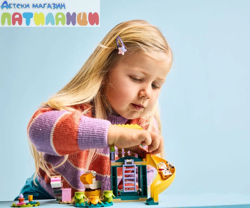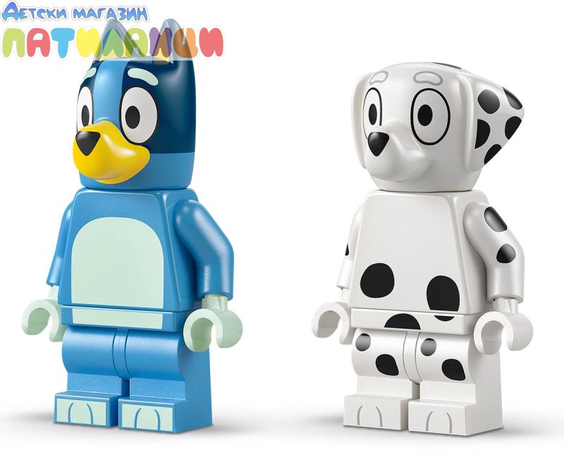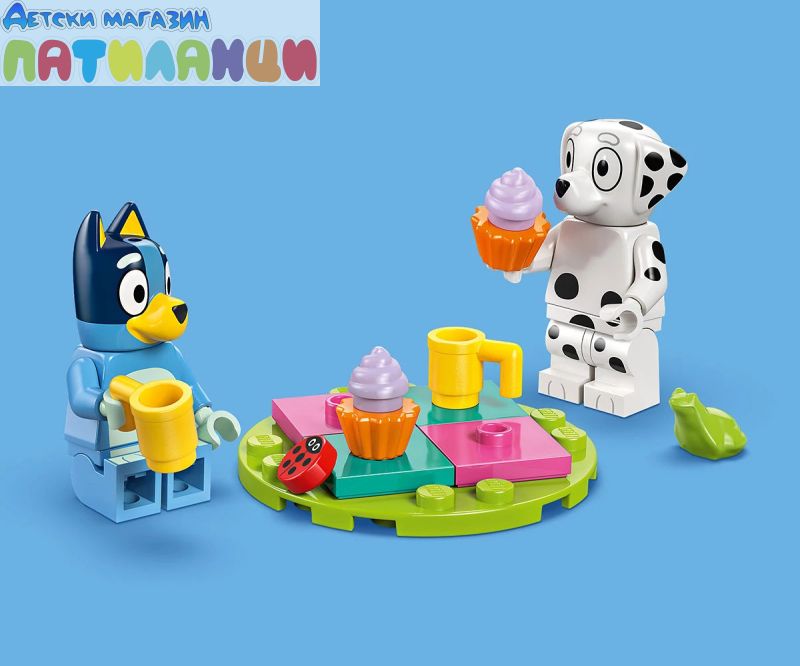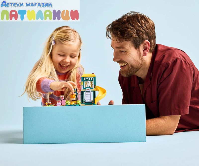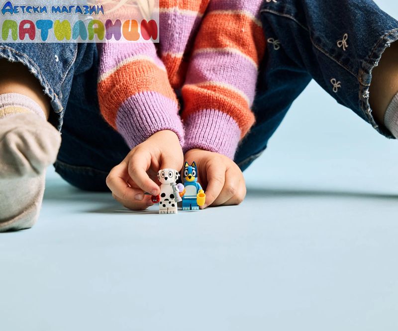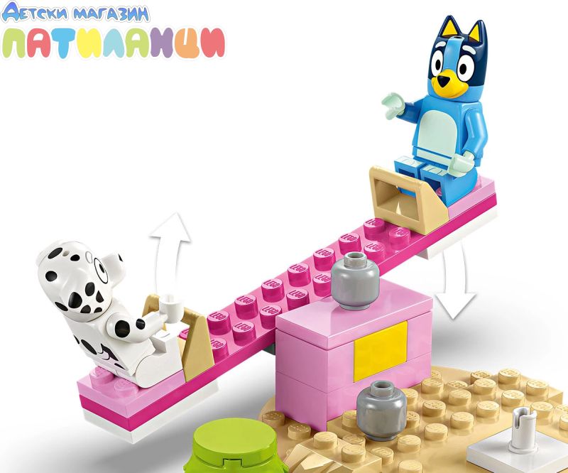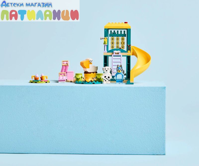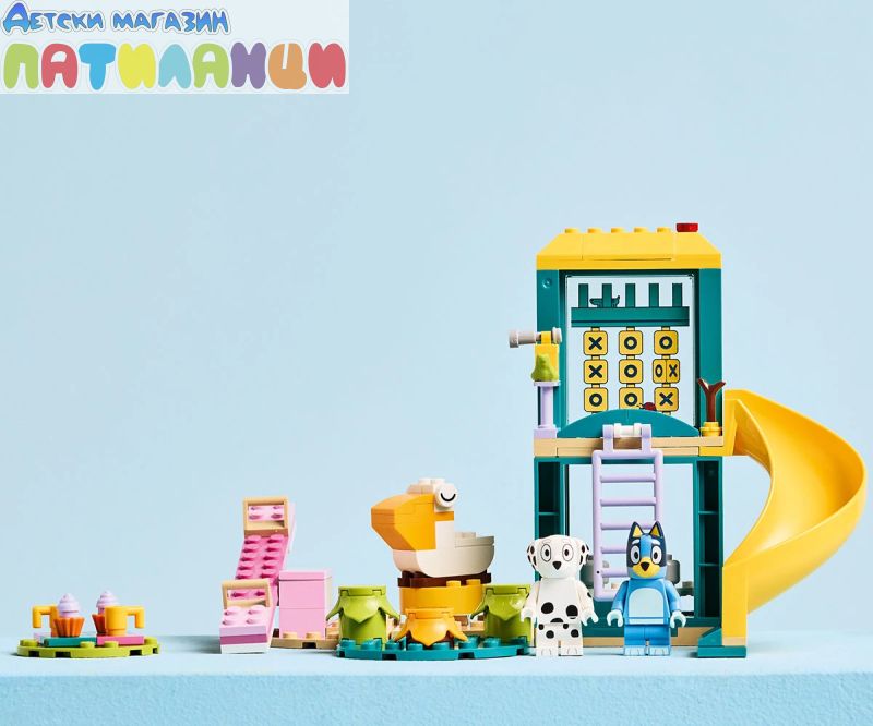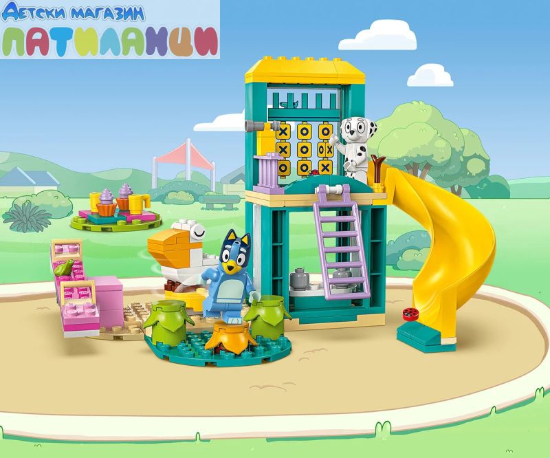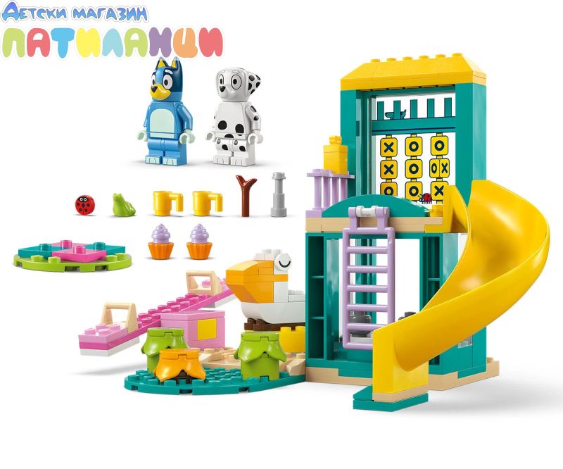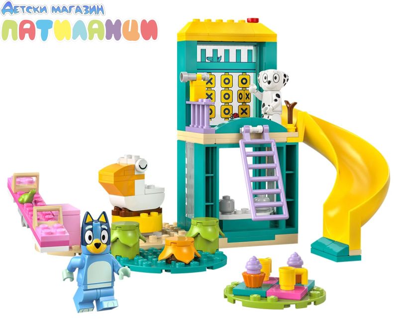 Интерактивна играчка за деца над 4 години – феновете на ТВ сериала Блуи се присъединяват към минифигурките на Блуи и Клои на площадката във весели цветове, където има люлка, пързалка, зона за катерене и други;