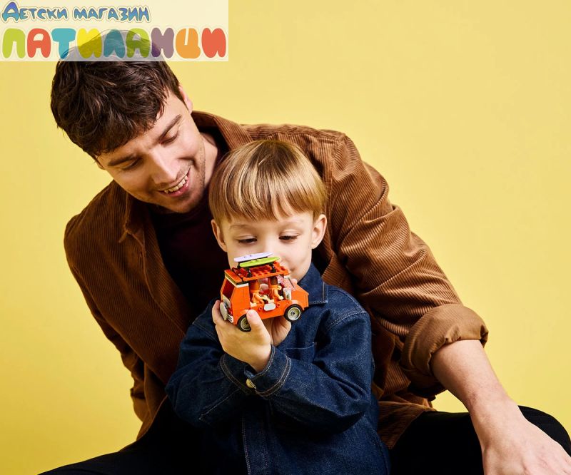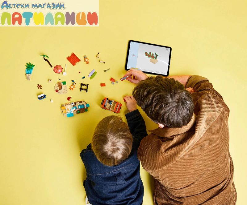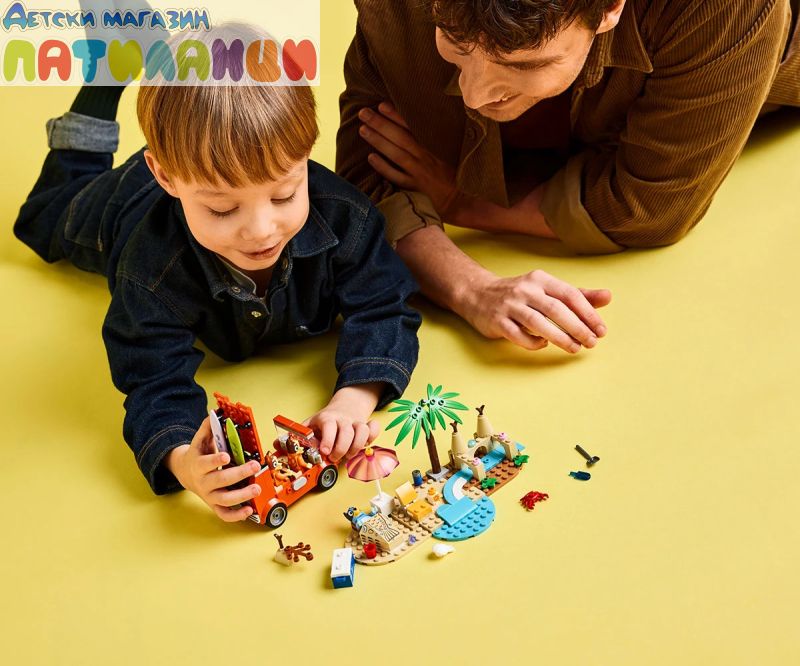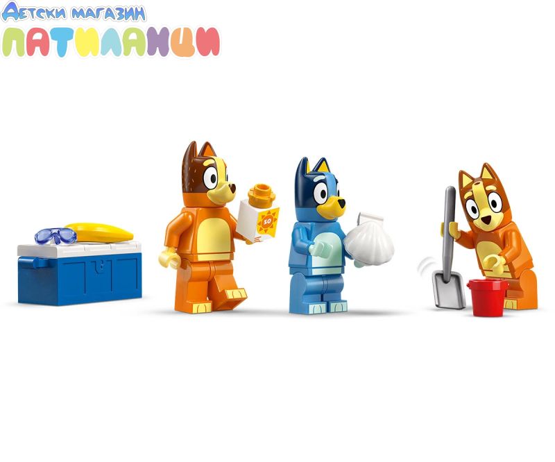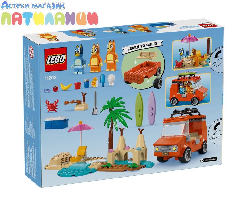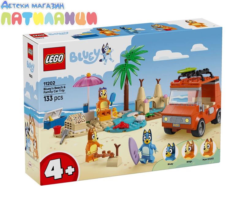 В „Пътуване до плажа със семейната кола на Блуи“ (11202) Блуи, Бинго и мама натоварват колата за един изпълнен със забавления ден на плажа. Тази интерактивна предучилищна играчка за феновете на ТВ сериала Blui е идеална за деца на възраст над 4 години, като предлага безкрайна игра с въображение и развива техните творчески умения и умения за решаване на проблеми. Тази играчка LEGO® включва емблематичното кола от сериала Блуи с 2 дъски за сърф, прикрепени отгоре, и багажник отзад за съхранение на охладителя. Отварящият се покрив на колата дава на децата лесен достъп до интериора, където има седалки за минифигурките на Блуи, Бинго и Чили (майката на Блуи). Плажните елементи, които вдъхновяват въображаемата игра, чрез впечатляващ пясъчен замък, пясъчна русалка, в която може да се побере минифигура, шезлонг, чадър и палмово дърво. Аксесоарите включват рак, сладолед, слънчеви очила и слънцезащитен крем. С голямата начална тухличка за бързо започване на забавлението и цветна книжка с инструкции, комплектите LEGO за възраст над 4 години са идеалният начин за възрастни и деца да споделят творческото забавление.