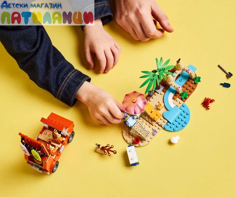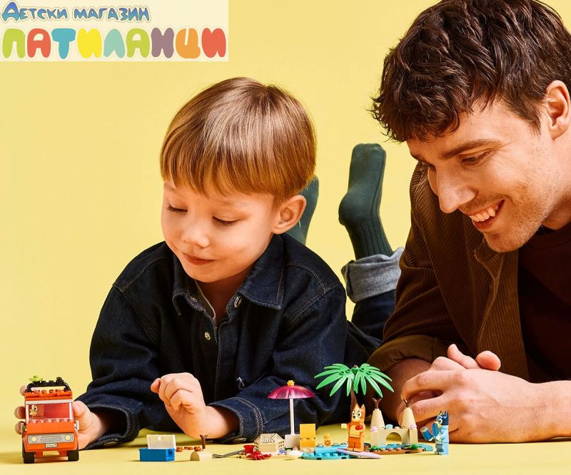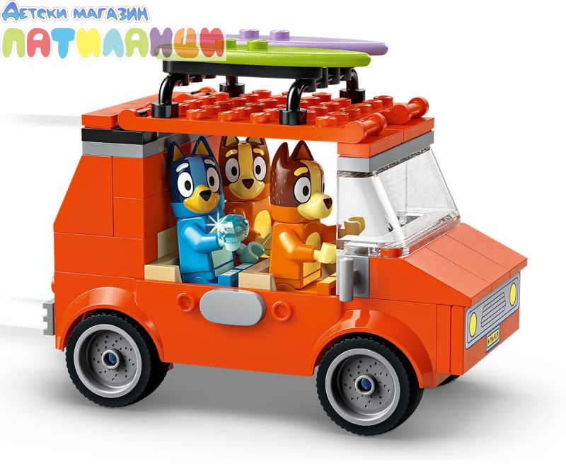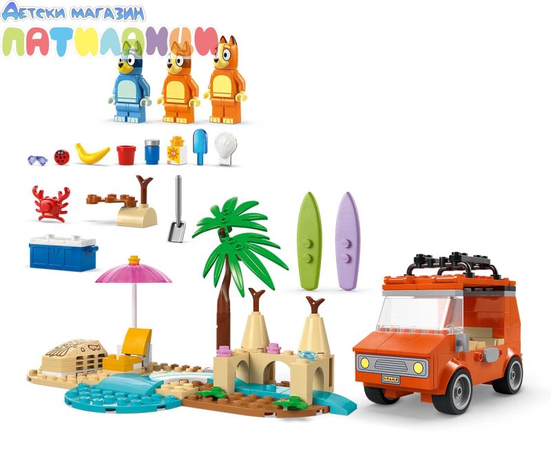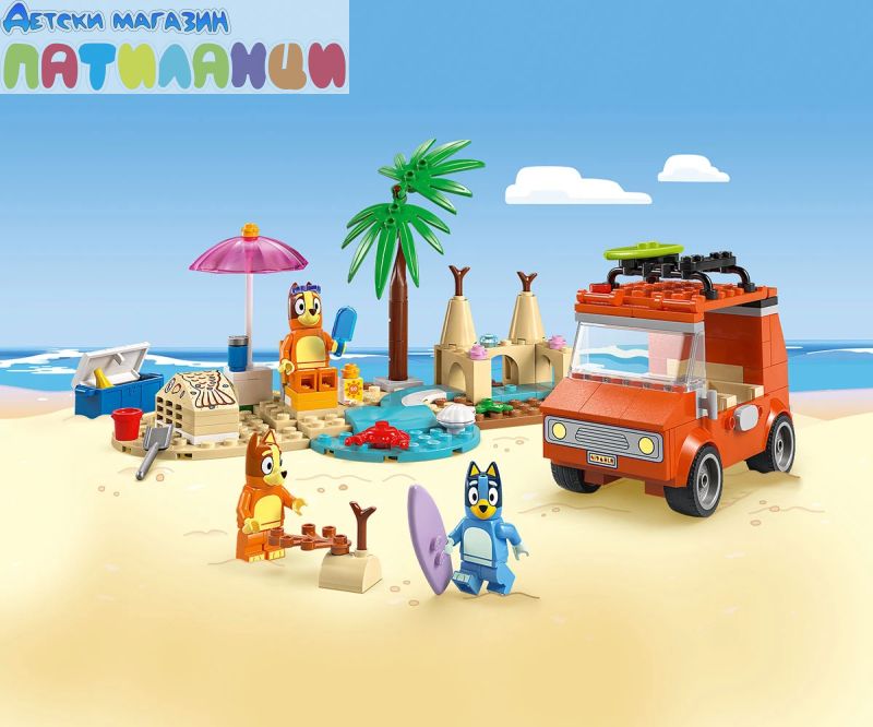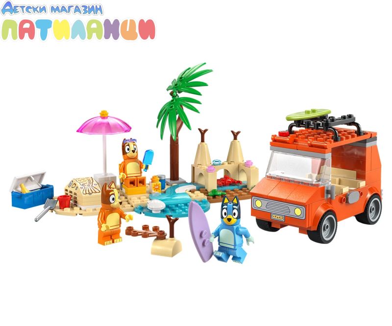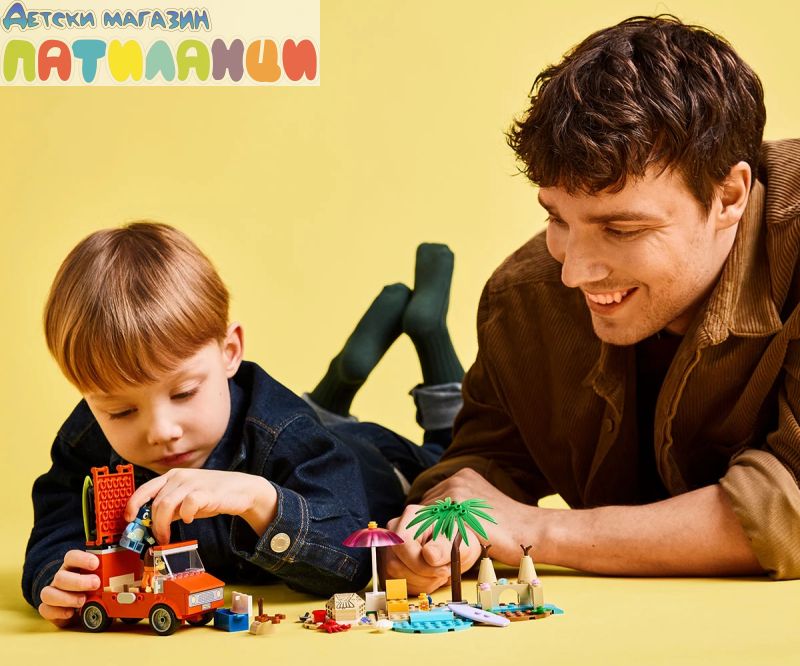 Интерактивна играчка за построяване за деца – този забавен комплект за игра включва минифигурки LEGO®, кола и много дейности за забавен ден на плажа с Блуи, Бинго и мама;