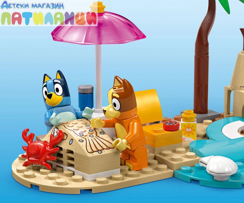 Въображаема игра с Блуи на плажа – има пясъчен замък, опашка на русалка от пясък (в която може да се побере минифигура), шезлонг, чадър, палмово дърво, рак, сладолед, слънчеви очила и слънцезащитен крем;