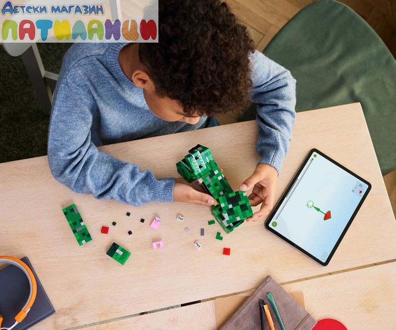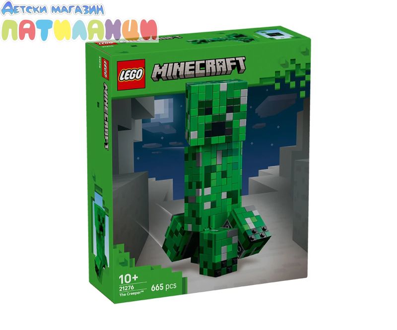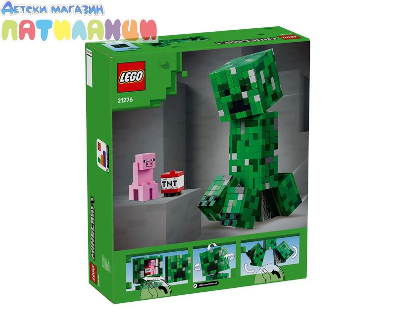 LEGO® Minecraft® Creeper™ (21276) е голяма подвижна екшън фигура, която децата могат да построят, да използват за игра и да излагат на показ, за да се възхищават всички. Тази емблематична декорация за стая за игри е идеален подарък за рожден ден, празник или друг повод за деца на възраст над 10 години със страст към Minecraft. Тази възстановка за конструиране на емблематичния Creeper за Minecraft е с височина над 21 см. Има 4 подвижни крака и подвижна глава, която се завърта наляво и надясно и се накланя нагоре и надолу. Предната част на главата на фигурата на Creeper от LEGO Minecraft се отделя, за да разкрие цялото пространство, съдържащо първата версия на Creeper и TNT елементи. За допълнително цифрово забавление строителите могат да използват интуитивното приложение LEGO Builder, за да машинират, завъртат модели в 3D и да проследяват напредъка си. Комплектът съдържа 665 части.