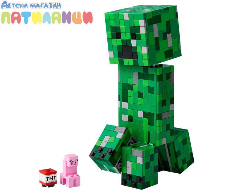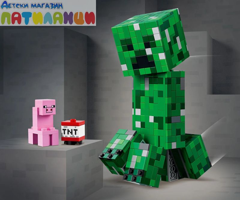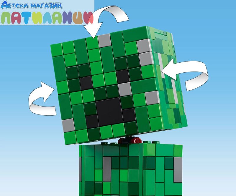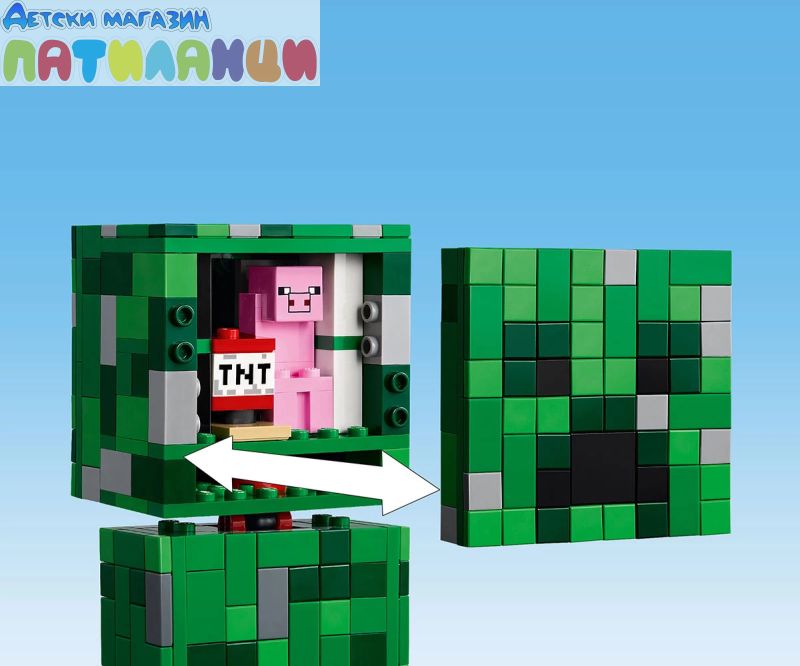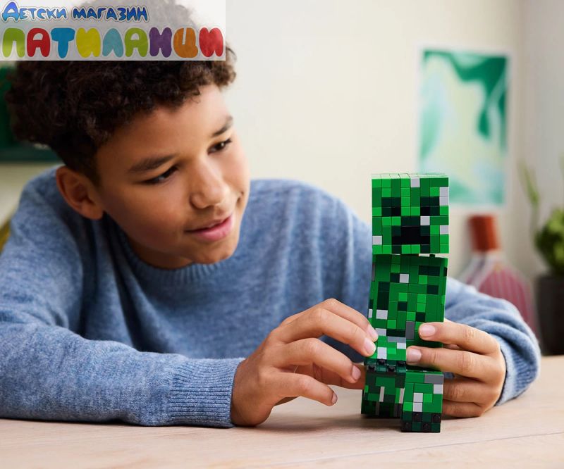 Този Creeper™ винаги е готов за действие – независимо дали надниква от света на Minecraft® или стои на показ в стаята ви. Освен това пази скрита изненада. Открийте предната част на главата на Creeper, за да откриете миниатюрна първа версия на Creeper и TNT елемент. Точно това, от което се нуждаете за експлозивно Minecraft приключение!