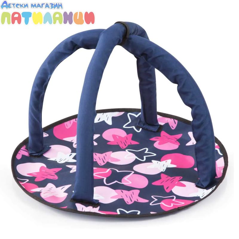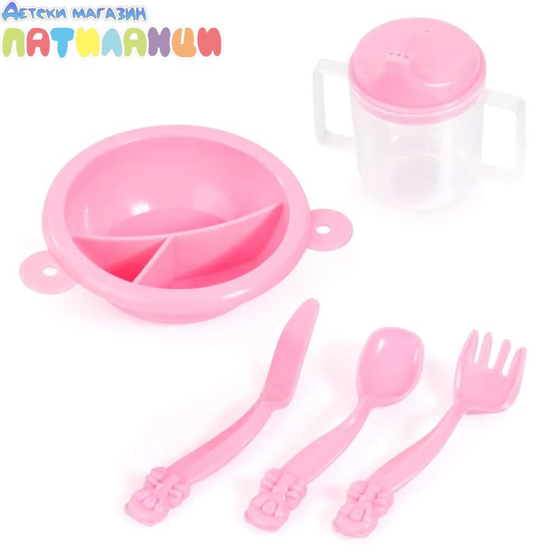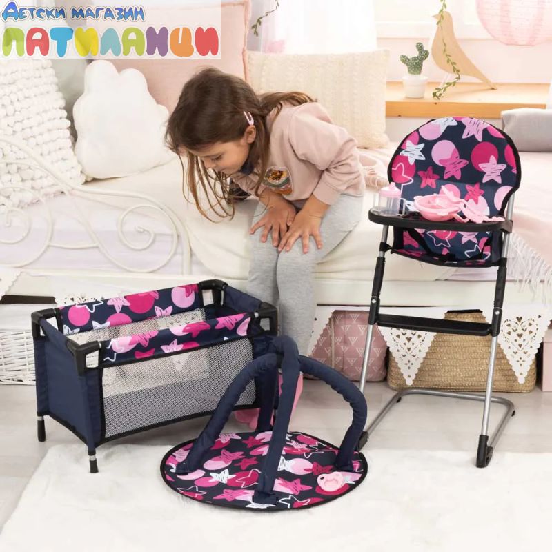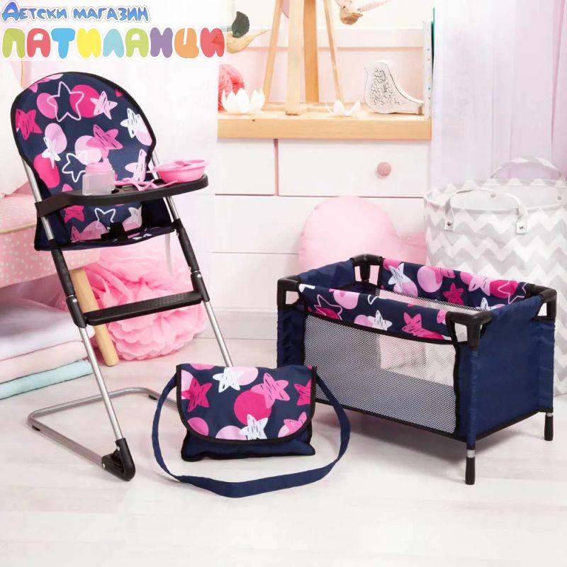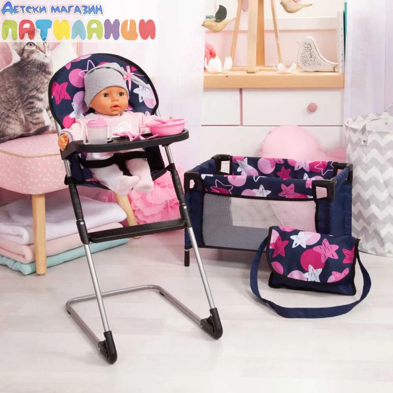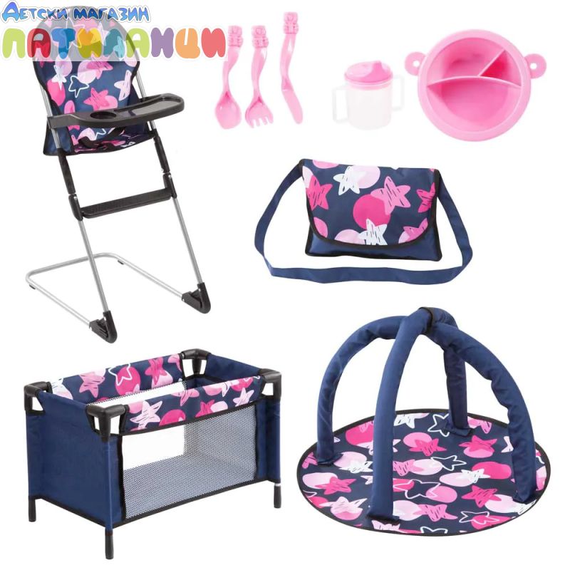 Този комплект аксесоари за кукли включва столче за хранене, чанта, чиния с вилица, лъжица, нож и чашка, сладко килимче за активна гимнастика и пътно легло (подходящо за кукли до 40 см).