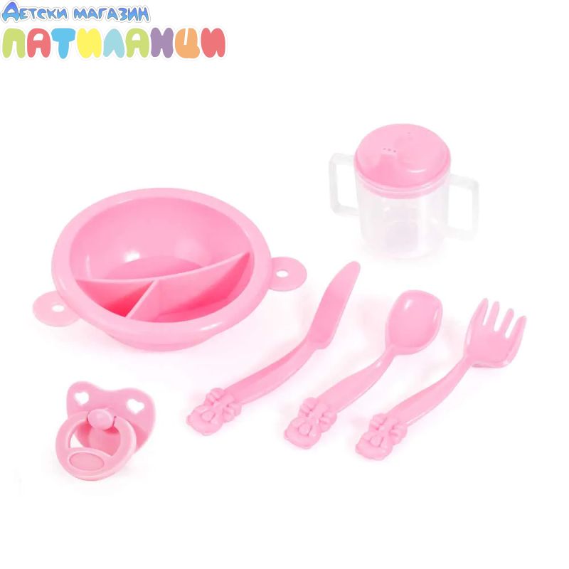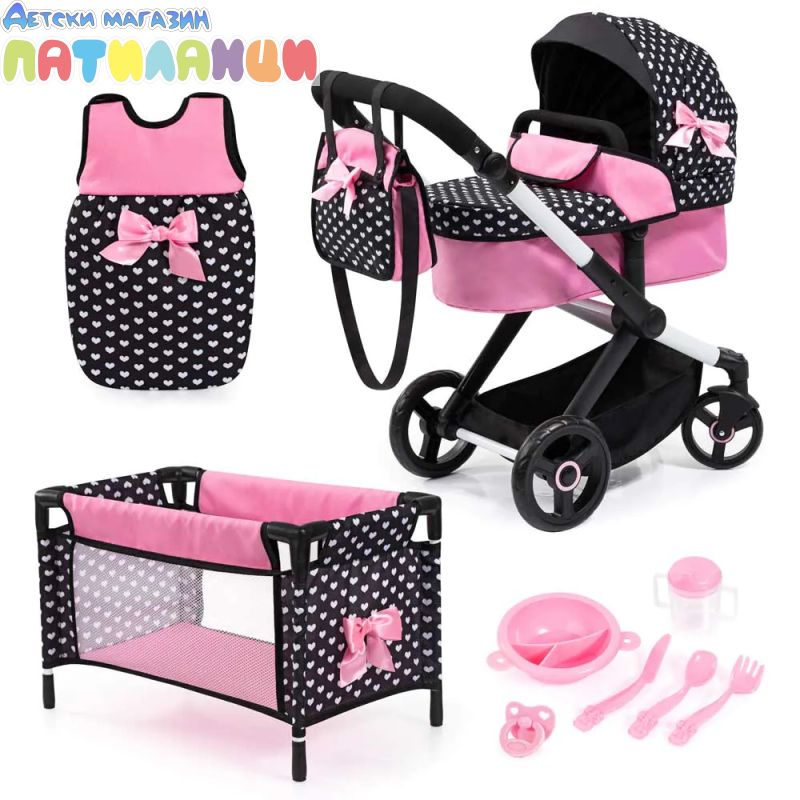 Комплектът включва: количка за кукли, легло за кукли, пластмасови прибори, чанта и спален чувал.