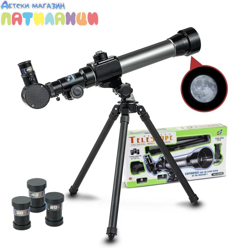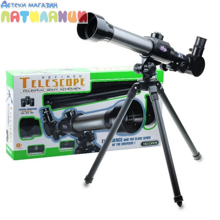 Страхотна образователна играчка – телескоп, част от каталога на .Телескопът пристига в комплект със стабилен триножник, на който да бъде закрепен. Заниманията с него подпомагат развитието на въображението и стимулират интереса на малчуганите към науката. Продуктът е подходящ за деца над 8 години.