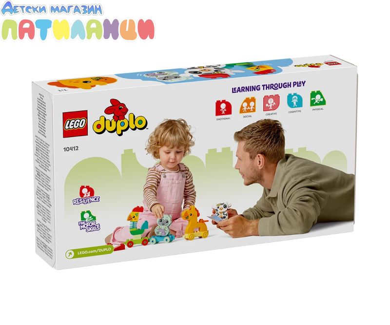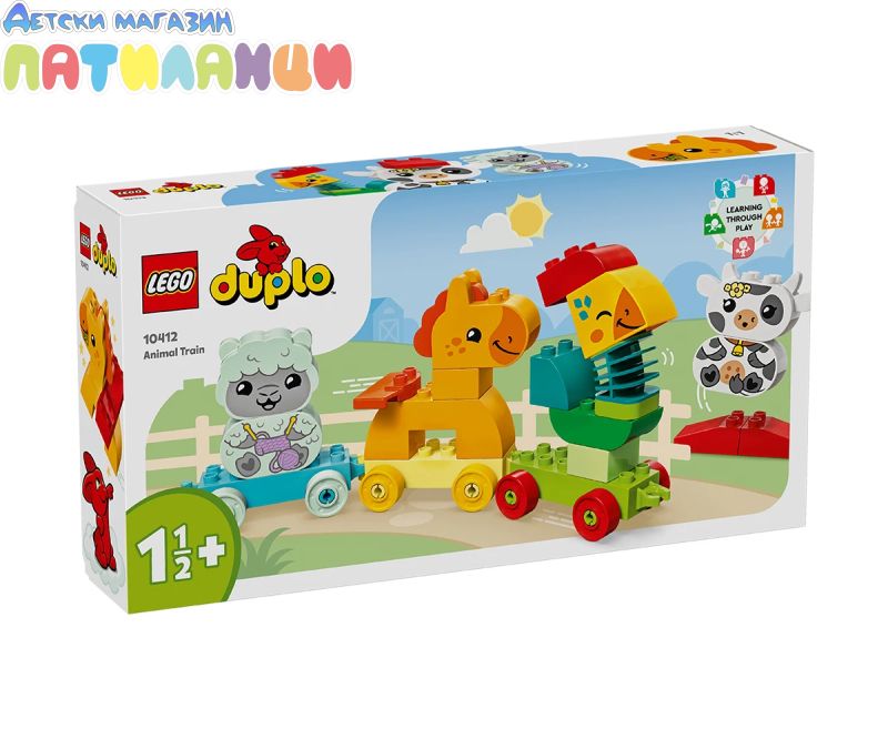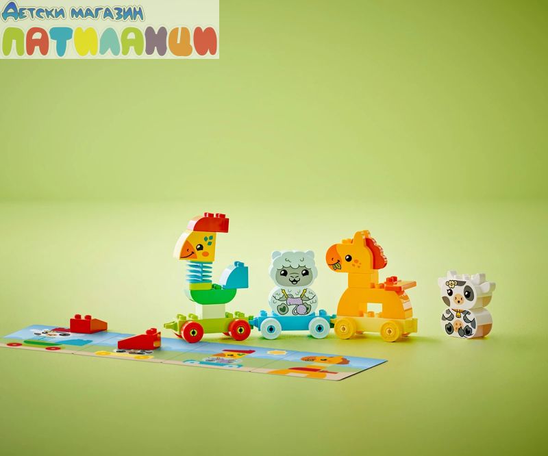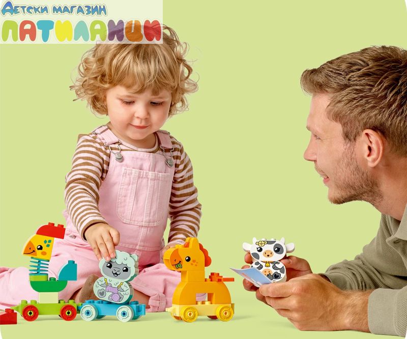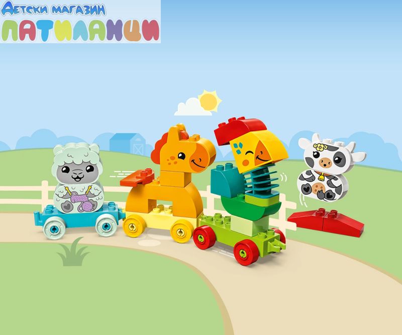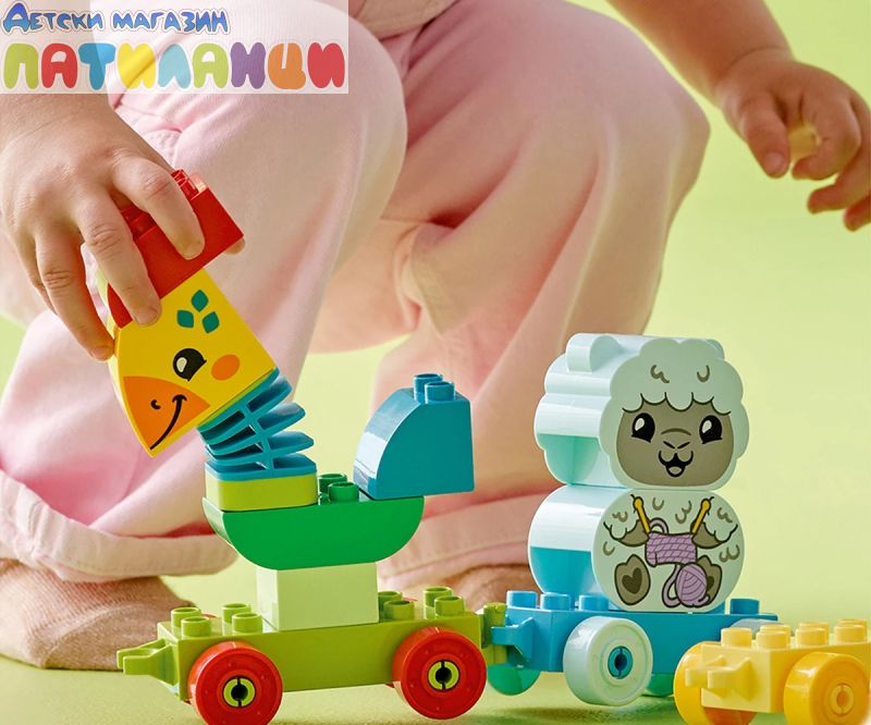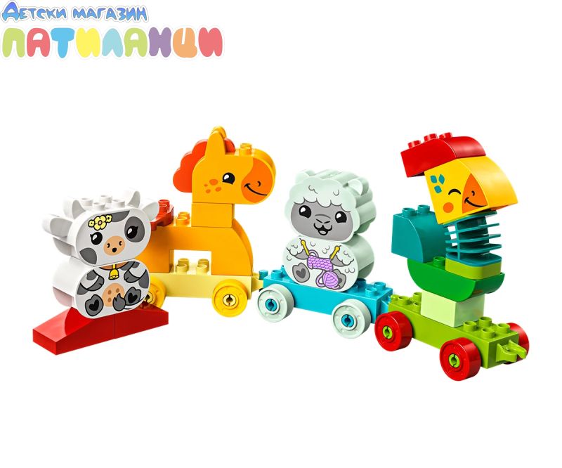 Всички на борда за часове творческо съпоставяне на цветове със забавен комплект LEGO® DUPLO® Моят първи влак за животни. Малките деца решават кое животно в кой вагон да седи в зависимост от цвета им, и построяват и променят сладките селскостопански животни по желания от тях начин. Те ще развият важни двигателни умения, докато свързват вагоните и разклащат еластичната шия на петела.