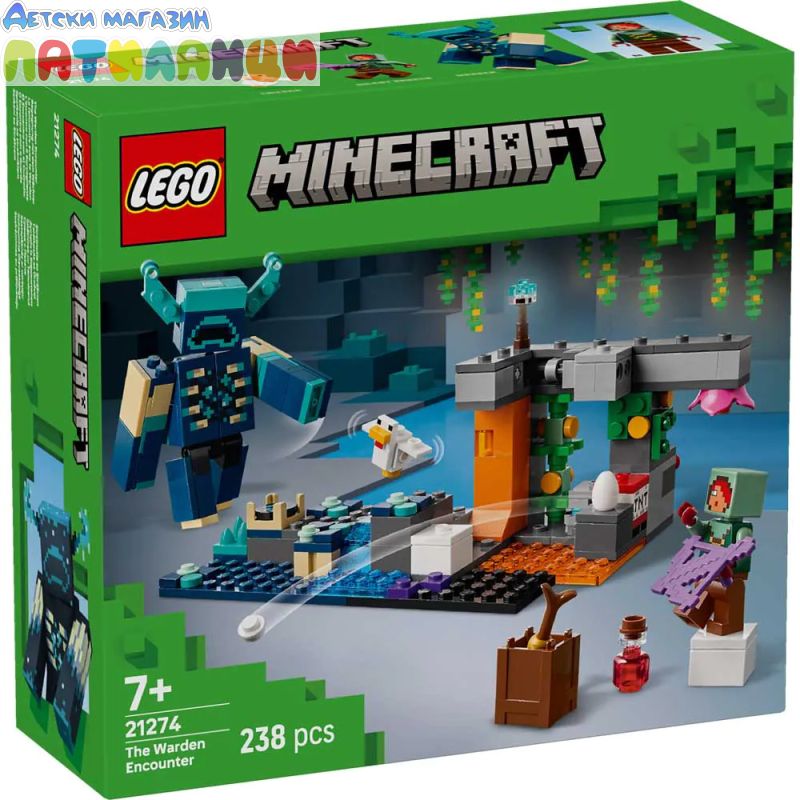 „Среща с Пазача“ (21274) е играчка LEGO® за геймъри, която отвежда играчите на Minecraft® на изпълнено с екшън минно приключение в дълбоката тъмна тучна пещера. Тази колекционерска играчка Minecraft за момчета и момичета е страхотен геймърски подарък за рожден ден, празник или друг повод за деца на възраст над 7 години. Разположена в буйна пещера със скрити колекционерски диаманти и аметисти, тази универсална играчка за построяване LEGO включва минифигура Minecraft на Безшумен рейнджър, моб пиле и голяма фигура Minecraft на Пазач за конструиране с подвижна глава, ръце и крака. Елементите от играта включват ръчно задействана експлозия с TNT и падащ камък. Аксесоарите включват възстановяващ здравето златен морков и отвара. За цифрово забавление приложението LEGO Builder позволява на децата да използват устройството си, за да мащабират и завъртат модели в 3D. Комплектът включва 238 части.