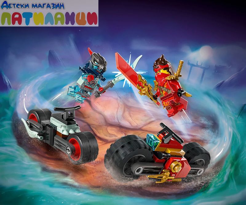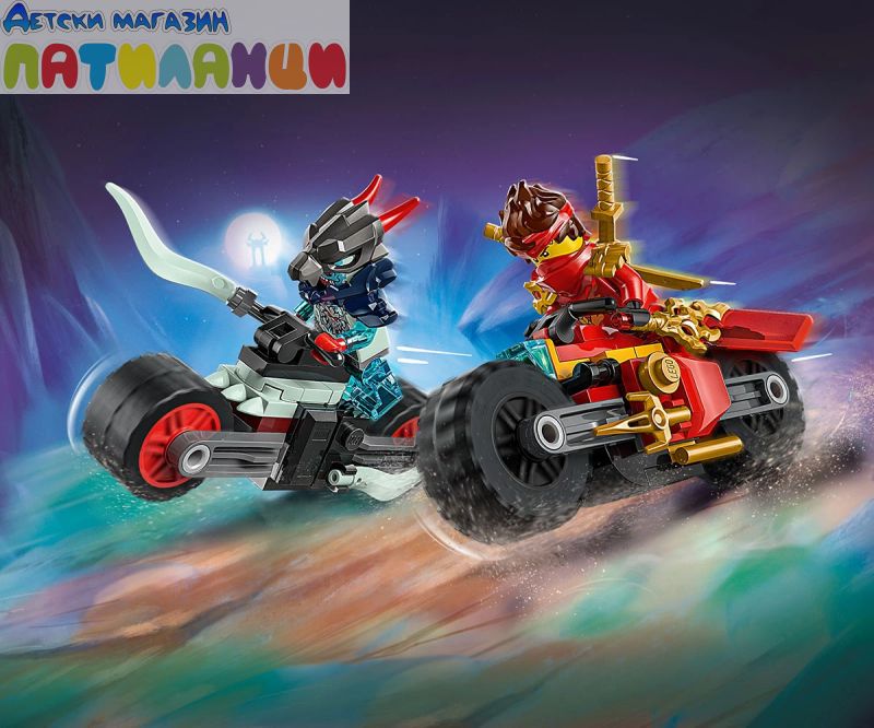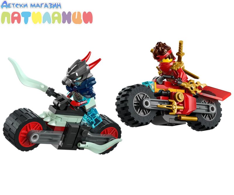 Обединете се с Кай на неговия суперготин състезателен мотоциклет, докато го преследва злият призрачен драконов скаут с демоничен мотор. Пригответе се за високоскоростен, вълнуващ екшън – трябва да избягате! Бъдете готови да скочите от мотора и да влезете в ръкопашен бой срещу злодея, който иска да грабне ценното прозрачно острие на Кай. Нинджата трябва да спечели тази битка!