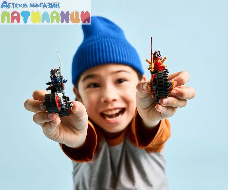 Със строителния комплект LEGO® NINJAGO® с 2 нинджа мотоциклета и 2 минифигури децата разиграват истории от сезон 3 на ТВ сериала NINJAGO Dragons Rising.