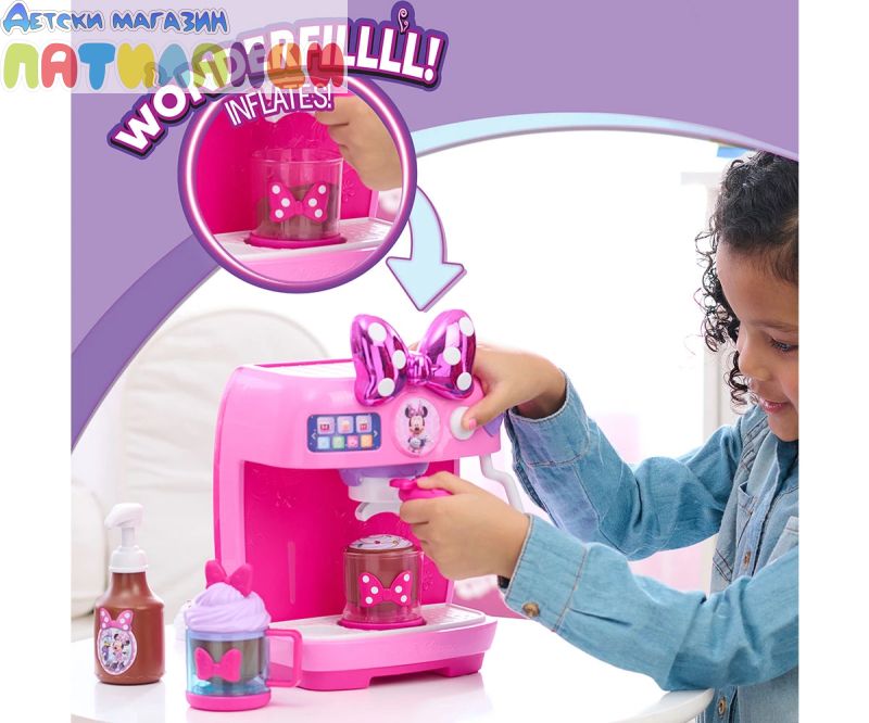 Създай незабравими кафе-моменти с този комплект от 10 части за деца, вдъхновен от Мини Маус! Играчката-еспресо машина предлага светлини, реалистични звуци, фрази от Мини Маус и две сладурски чашки с панделки, които се пълнят „до ръба“! Постави филтъра в машината, заключи го и сложи чашката върху подложката. Натисни белия бутон и виж как системата Wonderfill надува „кафето“ в чашата – сякаш истинска еспресо машина работи! Разбий „мляко“ с каничката за пяна, добави „сироп“ и капаче със сметана, за да довършиш напитката. А когато е време за ново кафе – източи чашката с помощта на панделката на Мини или с тампера отдолу. Комплектът е перфектен за ролеви игри, създава безкрайни сценарии за игра с приятели и семейство и е чудесен подарък за всеки малък фен на Дисни!