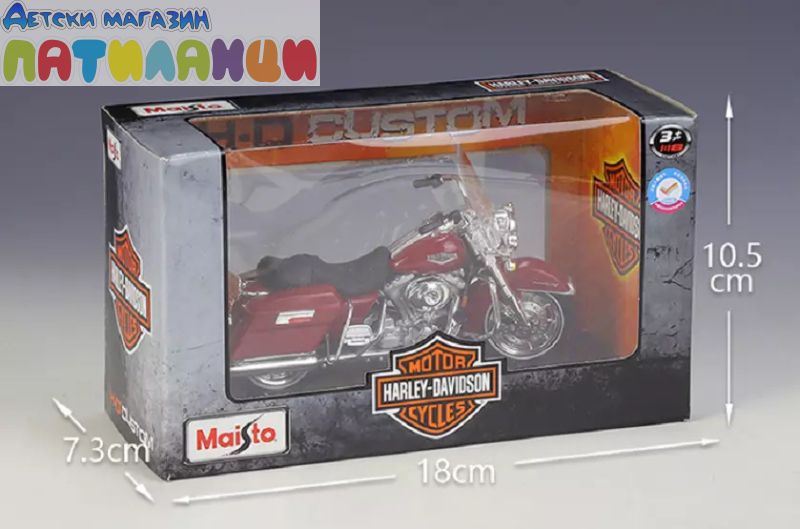 Това е миникопие на един "Харли", създадено по лиценза на "Maisto Tech", което точно повтаря оригинала. Множеството детайли са прецизно изработени от метал и пластмаса и приликата с истинското возило го прави страхотно попълнение за колекционери, както и привлекателна играчка за децата.
