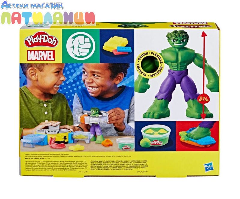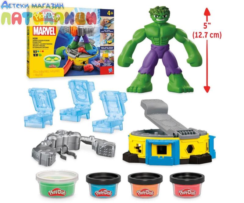 Разпалете въображението на децата с Play-Doh Marvel Hulk Smash & Squish комплект за игра! Тази играчка на Хълк включва гъвкава фигура на Хълк с височина 12,7 см и страхотни аксесоари Play-Doh, които позволяват на децата да възпроизвеждат епични истории. Използвайте 360-градусовата преса Play-Doh, за да оформите танкове, камиони, фигурка на М.О.Д.О.К., I-лъчи, тръби и още. Облечете фигурката на Хълк в неговия костюм, за да можете да смачквате и пресова Play-Doh формите! Този комплект Play-Doh съдържа 142 грама пластилин. Играчки за въображение като този комплект Play-Doh Marvel са отличен подарък за момчета и момичета, които обичат играчки с Хълк, супергеройски фигурки, изкуства и занаяти за деца и играчки за въображаеми игри.