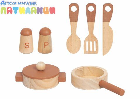 • Дървени аксесоари: тенджера, тиган с капак, прибори за окачване, солница и пиперница
